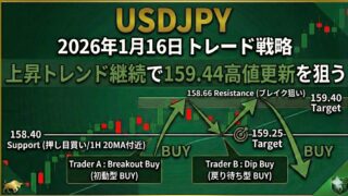 【USDJPY】2026年01月16日のトレード戦略 | 上昇トレンド継続で159.44高値更新を狙う