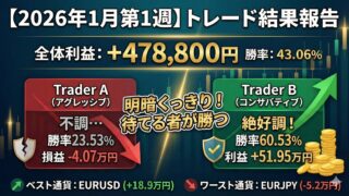 ※本記事はAIで集計および作成しているため、誤りを含む可能性がございます。1. 週間サマリー(Overview)2026年の幕開けとなる第1週は、「待つ」戦略(Trader B)が圧倒的な優位性を示す結果となりました。ブレイクアウト狙いのT...