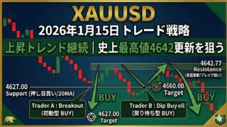 【XAUUSD】2026年1月15日のトレード戦略 | 上昇トレンド継続で史上最高値4642更新を狙う