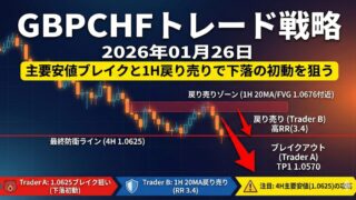 メタディスクリプション2026年01月28日のGBPCHF分析。4H・1H足ともに下降トレンド継続中、1.0580のサポレジ転換に注目。Trader A(ブレイク)とTrader B(戻り売り)の戦略で最大RR比3.4を実現する実践的テクニ...