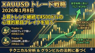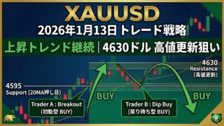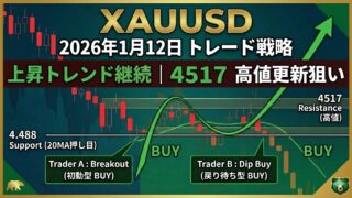 第1章: 概要(導入部)2026年1月16日(金)のGOLD(ゴールド/米ドル)について、裁量トレード×クオンツ分析の視点から戦略を立案しました。今日の市場は強気(Bullish)バイアスが強く、特に4625ドルの高値ブレイクに注目が集まっ...