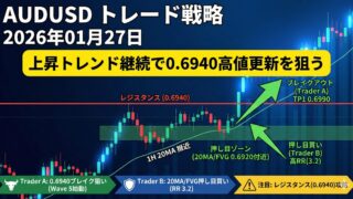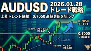 金曜日のNY市場、豪ドル(AUDUSD)は市場の予想を覆す強烈なインパルスを発生させ、心理的・テクニカル的な最重要関門である0.7000の大台を突破しました。本日の結論から言えば、**「極端な過熱感の冷却を待ち、0.7000近辺の流動性溜ま...