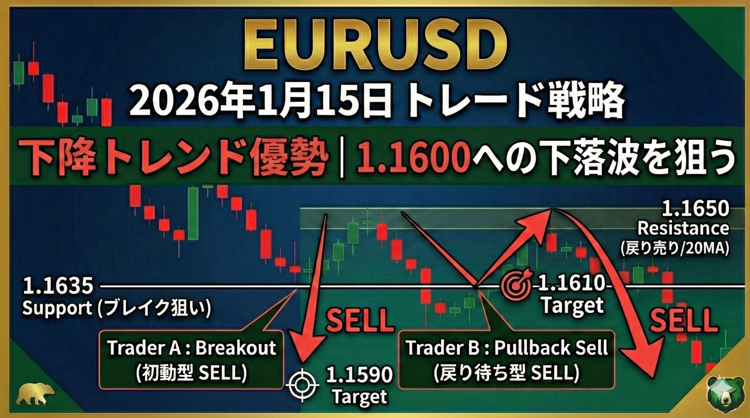 2026年01月15日のEURUSD分析。下降トレンド継続中、三角保ち合いからのブレイク(Trader A)および20MA戻り売り(Trader B)に注目。Trader A/B戦略でRR比2.66を実現。テクニカル分析に基づく実践的戦略。