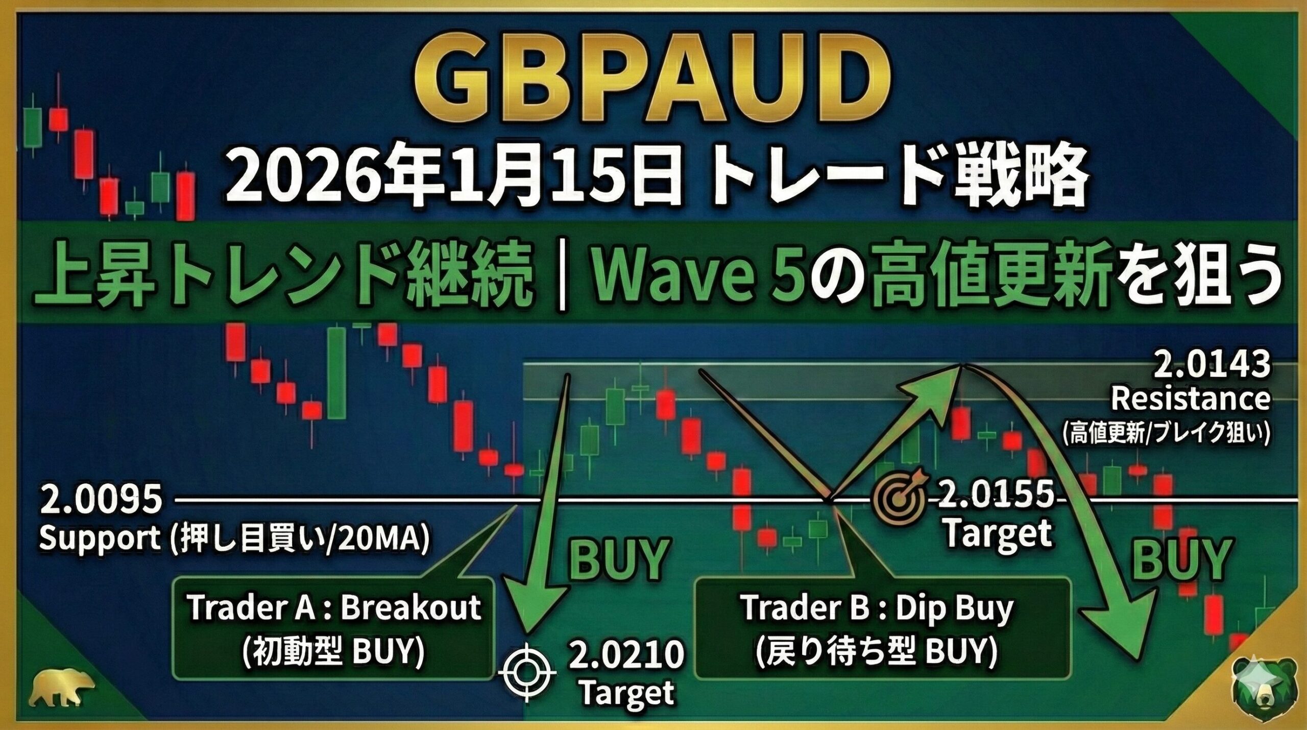 2026年1月15日のGBPAUD(英ポンド/豪ドル)分析。強力な上昇トレンド継続中、エリオット波動Wave 5の初動と20MA押し目買いに注目。Trader A/B戦略で最大RR比3.0を実現。テクニカル分析に基づく実践的戦略を解説します。
