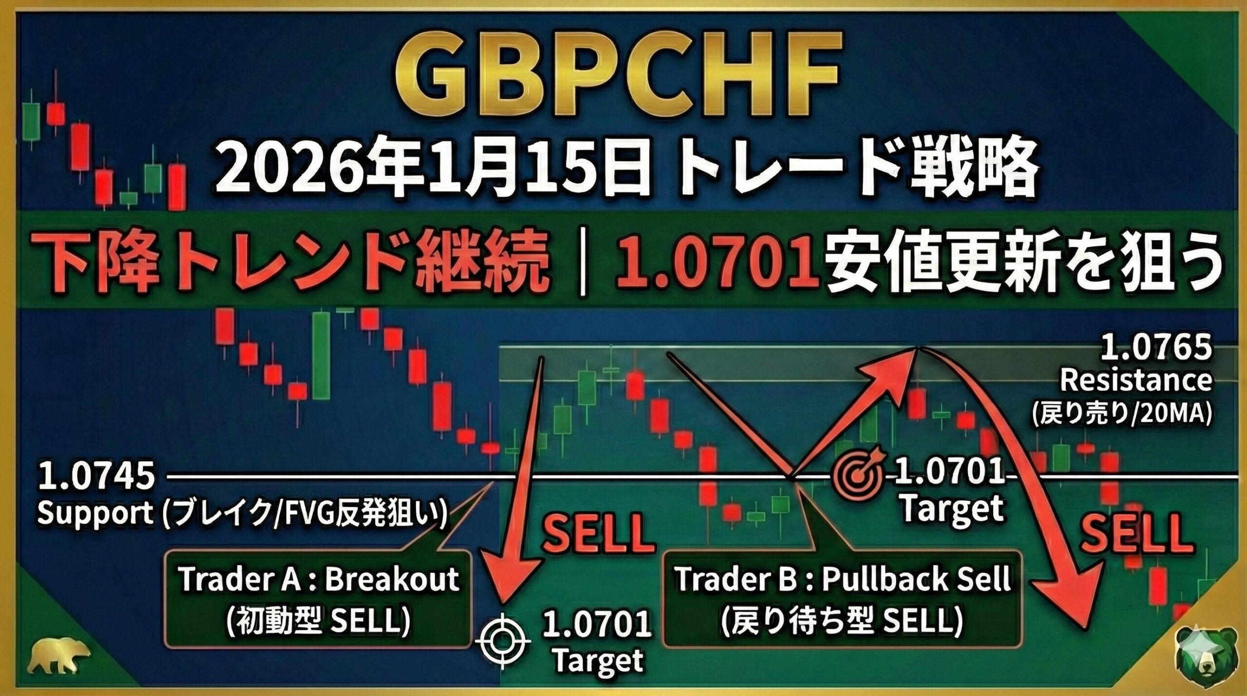 2026年1月15日のGBPCHF分析。下降トレンド継続中、1時間足20MA戻り売りに注目。Trader A/B戦略でRR比最大3.2を実現。テクニカル分析に基づく実践的戦略。