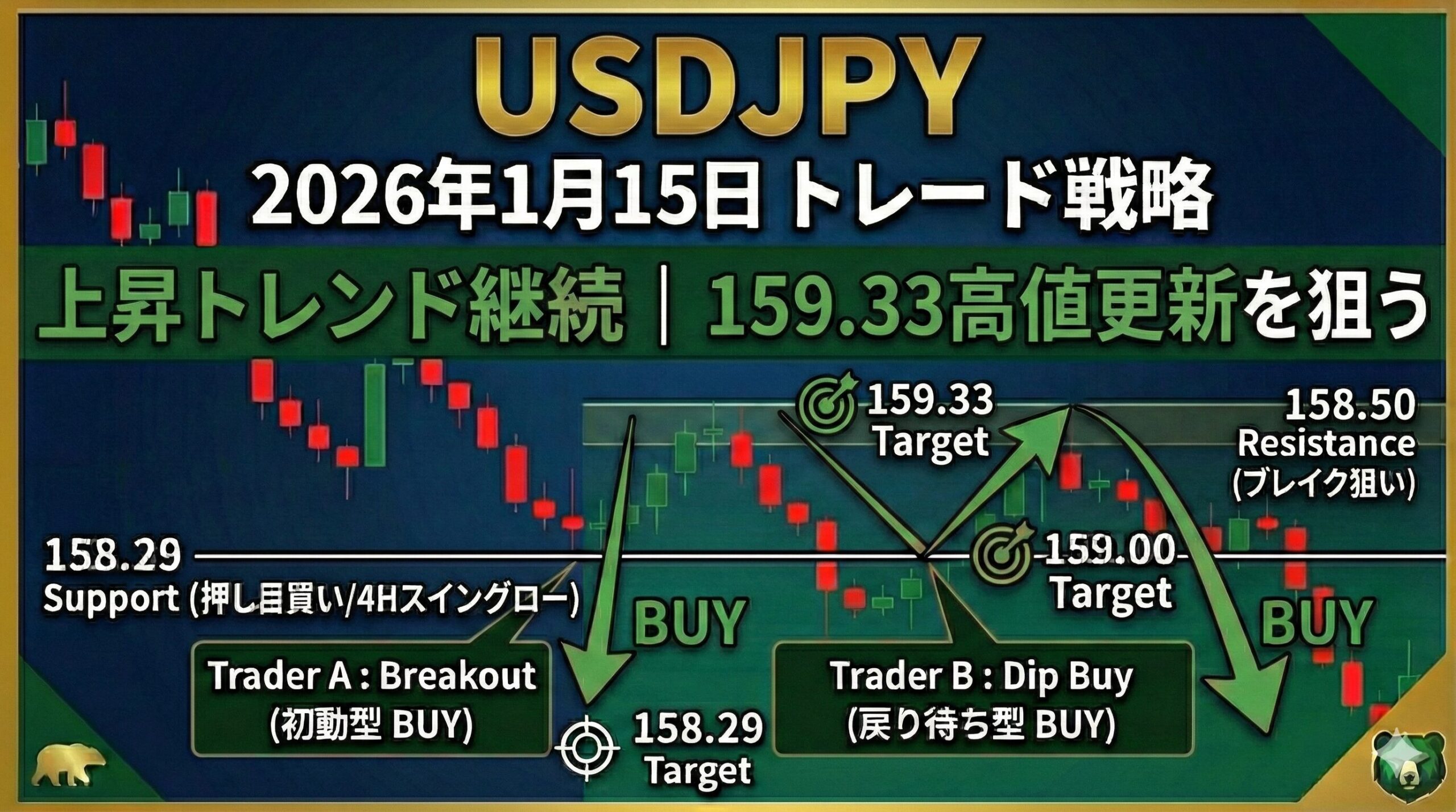 - Trader A(初動型): 調整終了のシグナルとなる158.50ブレイクアウト狙い