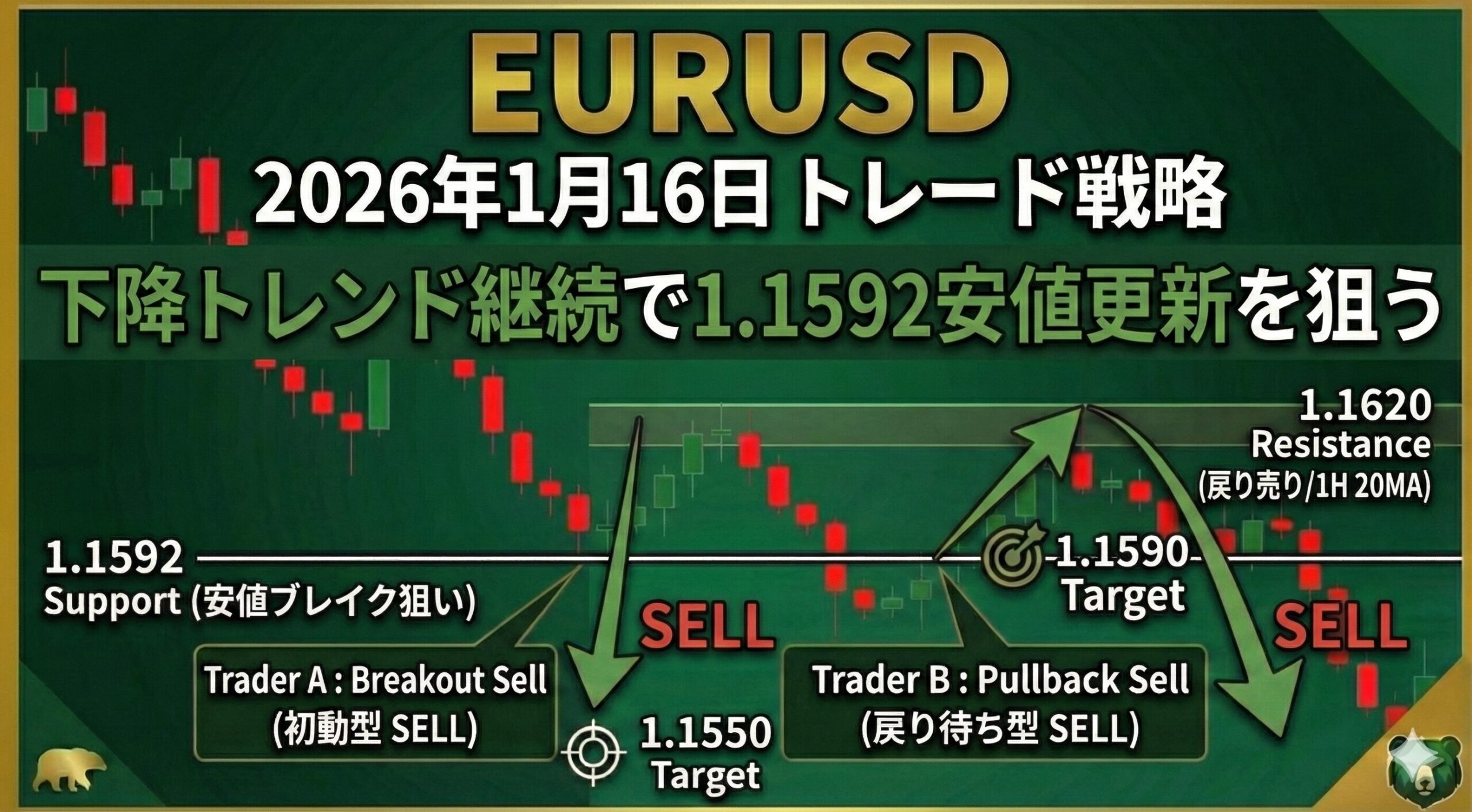 今日の市場は弱気(Bearish)バイアスが強く、特に1.15921の安値ブレイクと1.1620付近の戻りに注目が集まっています。