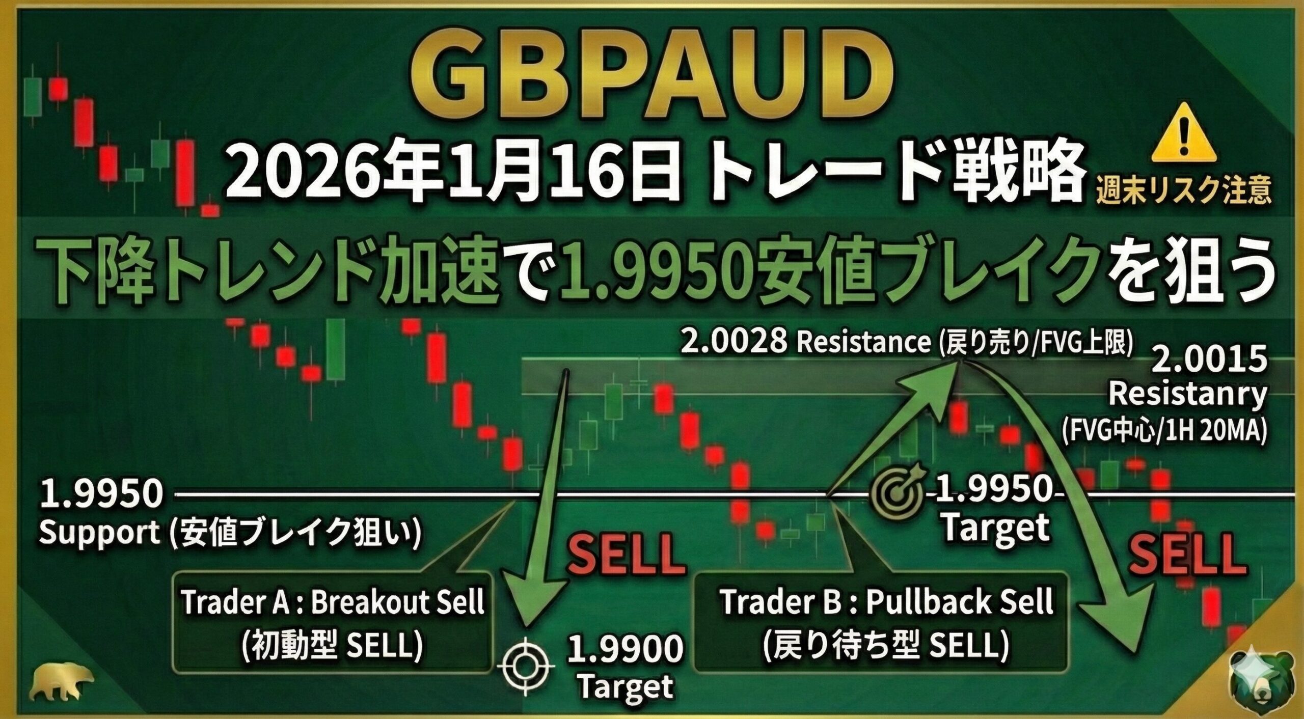 2026年1月16日のGBPAUD分析。1時間足での強力な下降トレンド継続中、1.9950の安値更新またはFVGへの戻り売りに注目。Trader A/B戦略でRR比2.0以上を実現。テクニカル分析に基づく実践的ショート戦略。