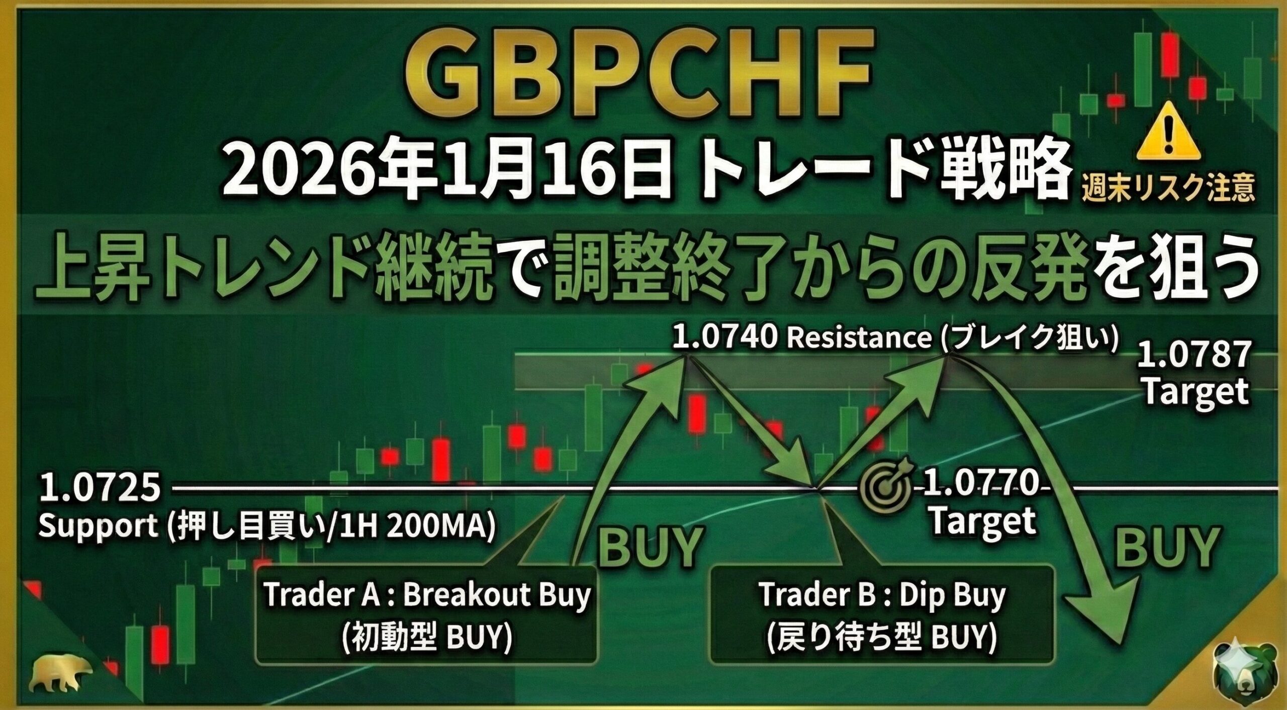 2026年1月16日のGBPCHF分析。上昇トレンド中の調整局面(Wave 4)、1.0725サポートおよび1.0740レジスタンスに注目。Trader A(ブレイクアウト)/B(押し目買い)戦略で最大RR比3.33を実現。テクニカル分析に基づく実践的戦略。