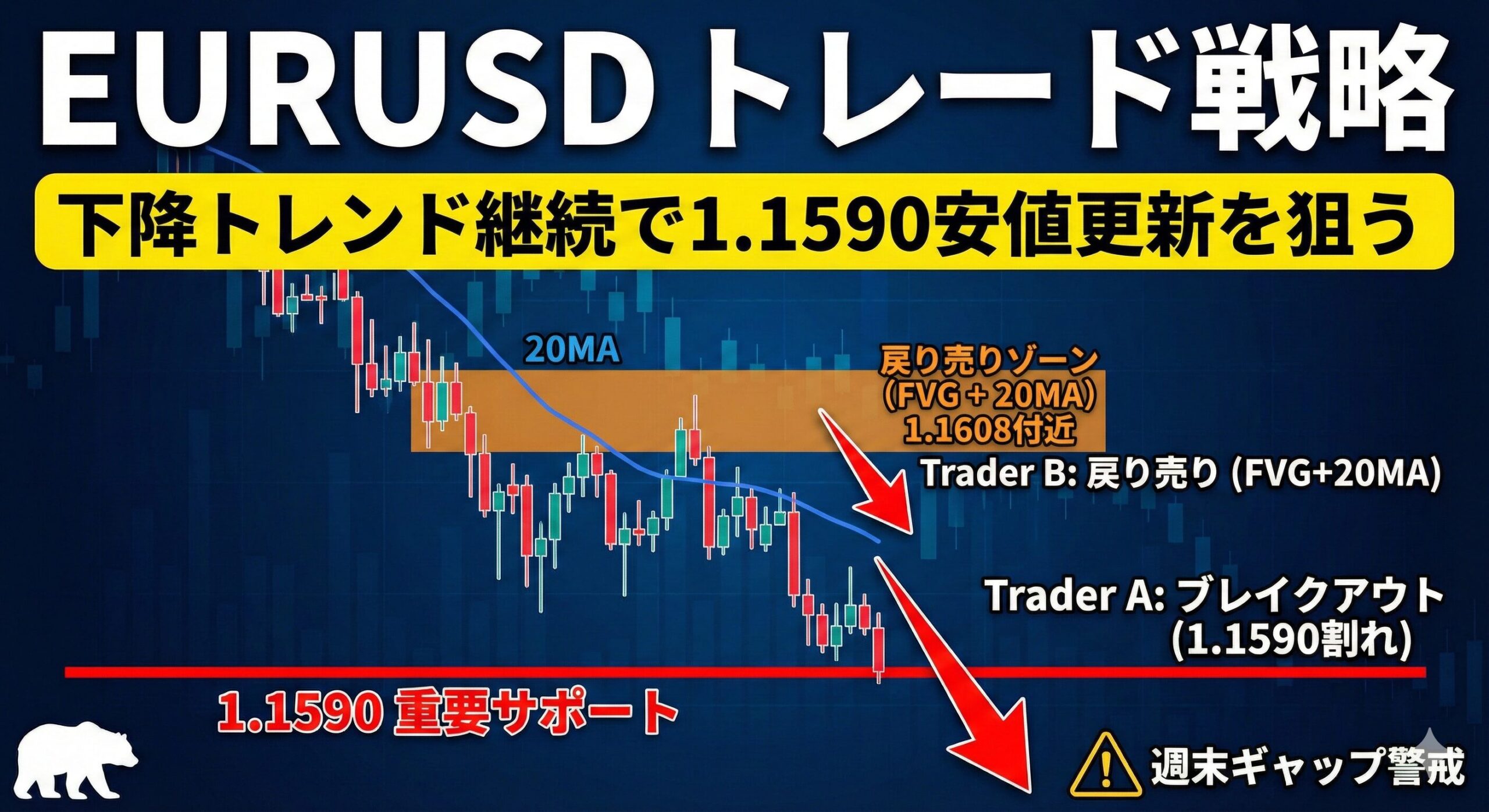 - テクニカル根拠: 心理的節目かつ直近安値圏の1.1590ブレイクは、売りオーダーのストップを巻き込み加速する可能性が高い。
