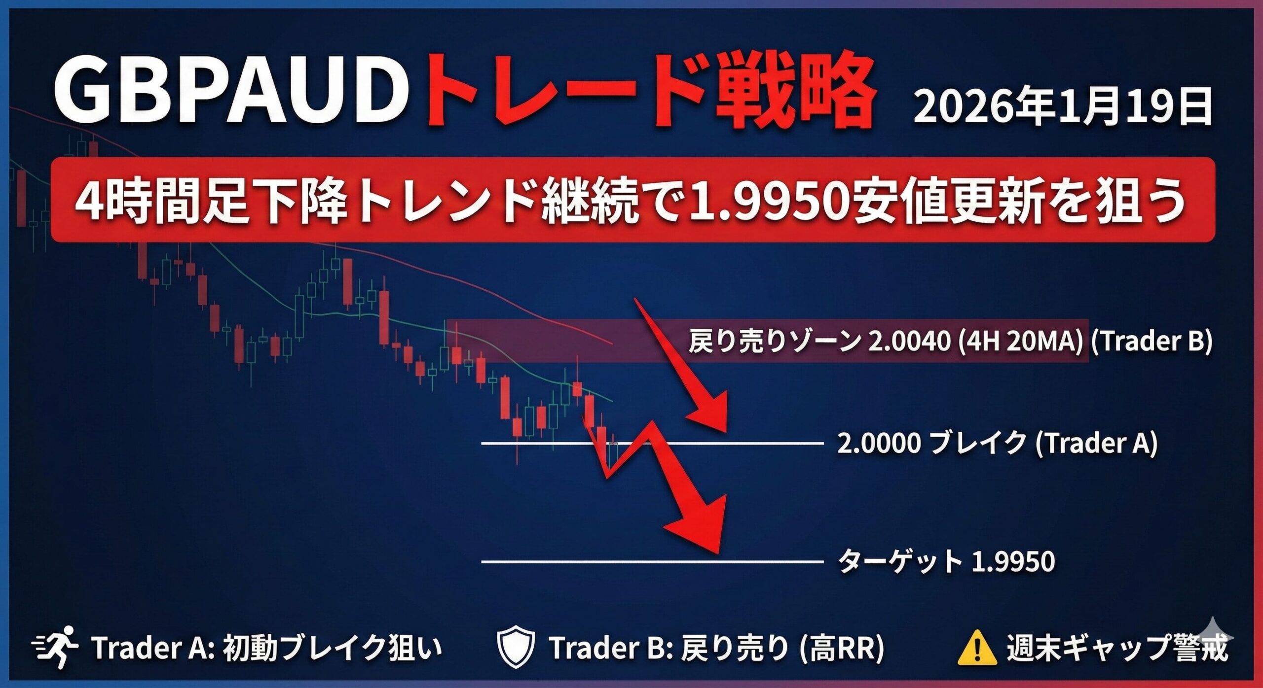 2026年01月19日のGBPAUD分析。4時間足の下降トレンド継続中、1時間足の調整終了に注目。Trader A(ブレイクアウト)とTrader B(戻り売り)の2つの戦略で、最大RR比2.0を狙います。週末明けの窓開けリスクにも対応した実践的戦略解説。