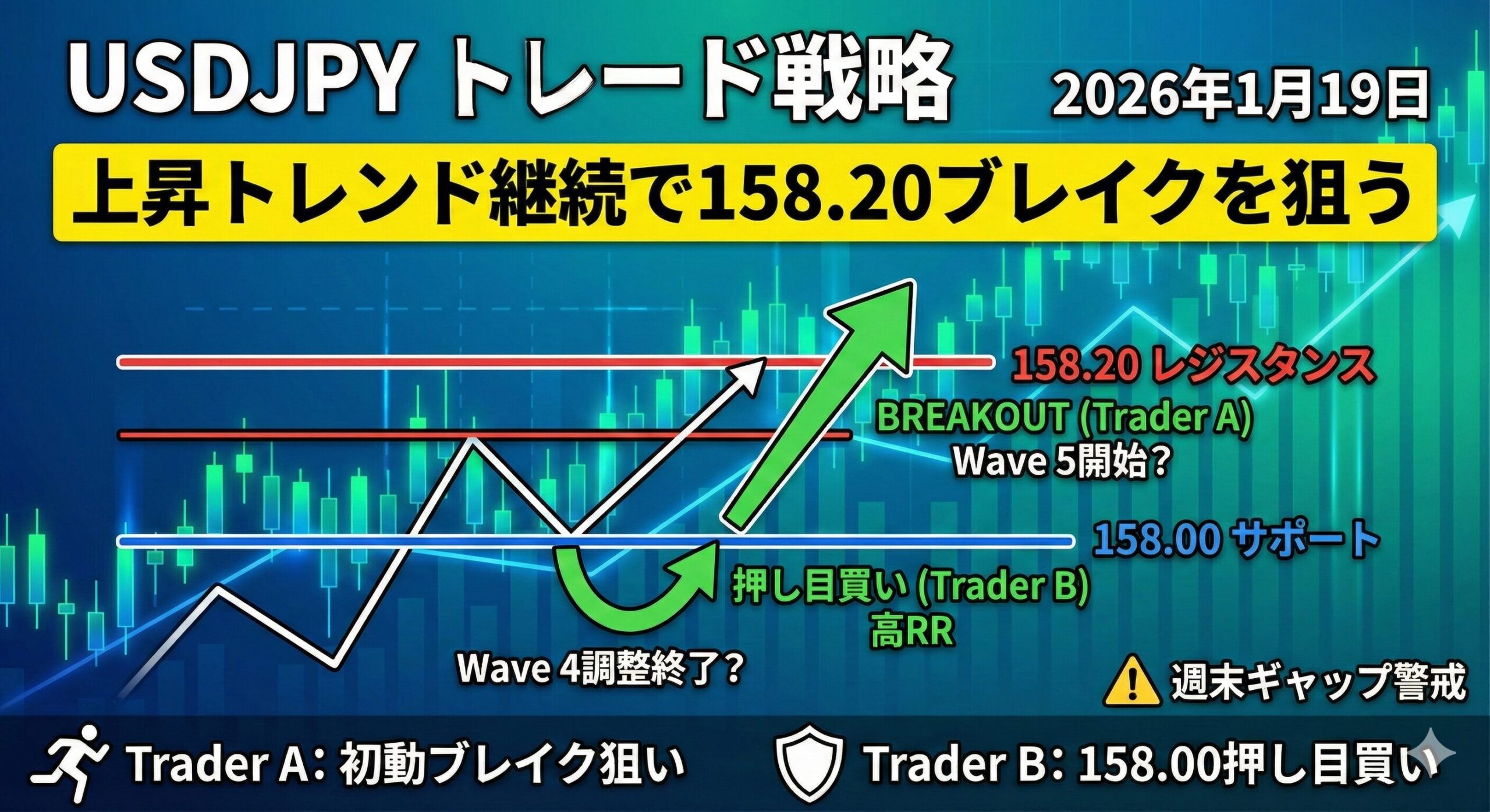 2026年1月19日のUSDJPY分析。長期上昇トレンド継続中、エリオット波動Wave4調整終了からの再上昇に注目。158.00サポートと158.20ブレイクを起点に、Trader A/B戦略で最大RR比2.6を実現する実践的戦略を解説します。