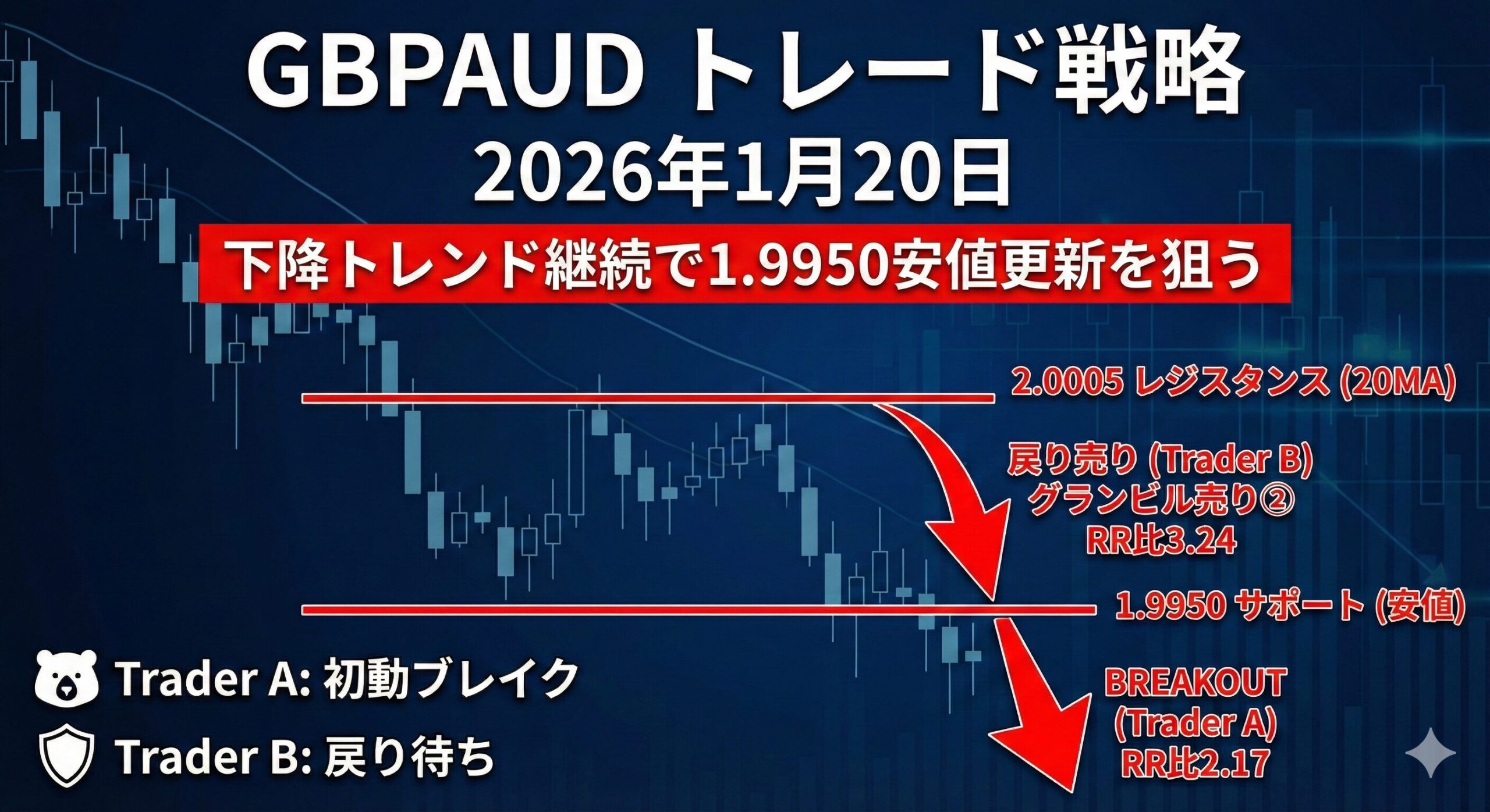 2026年01月20日のGBPAUD分析。下降トレンド継続中、20MA戻り売りに注目。Trader A/B戦略でRR比3.24を実現。テクニカル分析に基づく実践的戦略。