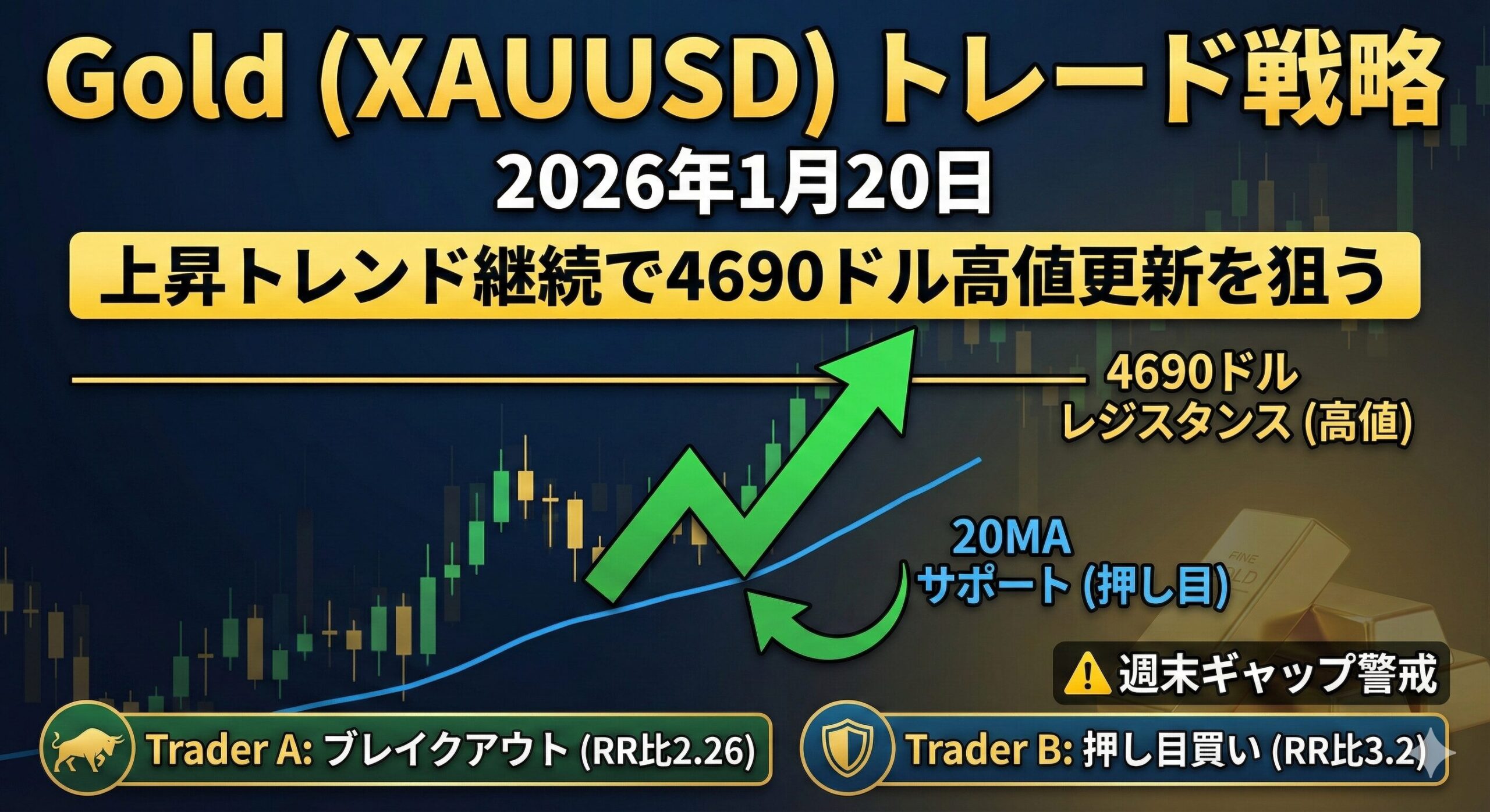 2026年1月20日のGold(XAUUSD)分析。週明けのギャップアップを経て強力な上昇トレンド継続中。Trader Aは4690ドルブレイク、Trader Bは20MA押し目買いを狙う。RR比最大3.2を実現する実践的戦略。