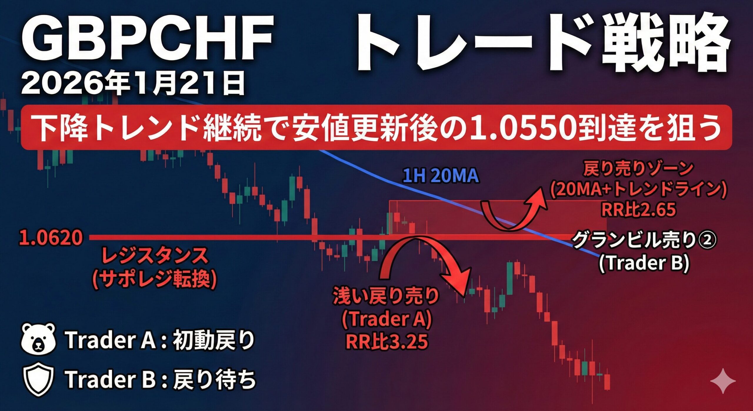 2026年1月21日のGBPCHF分析。下降トレンド継続中、1.0620のサポレジ転換と20MA戻り売りに注目。Trader A/B戦略でRR比最大3.25を実現。テクニカル分析に基づく実践的戦略。