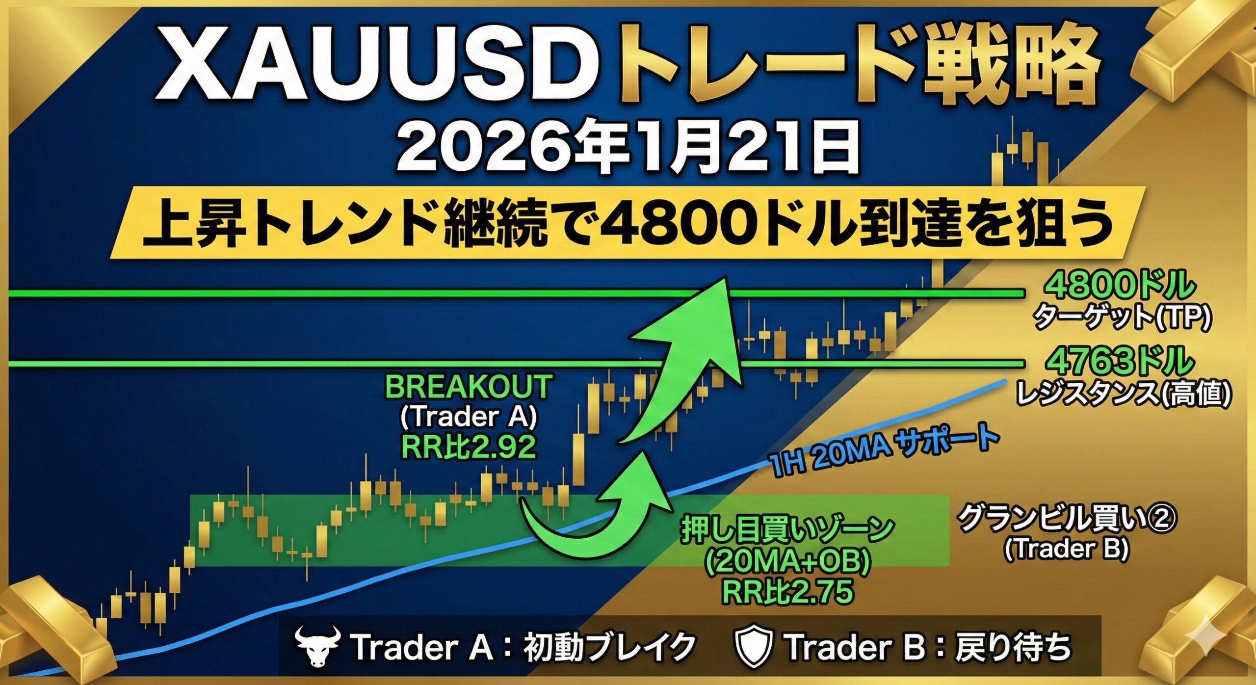 2026年1月21日のXAUUSD(ゴールド/米ドル)分析。強力な上昇トレンド継続中、4730ドルの20MA押し目買いまたは4763ドル高値更新に注目。Trader A/B戦略でRR比最大2.92を実現。テクニカル分析に基づく実践的戦略。