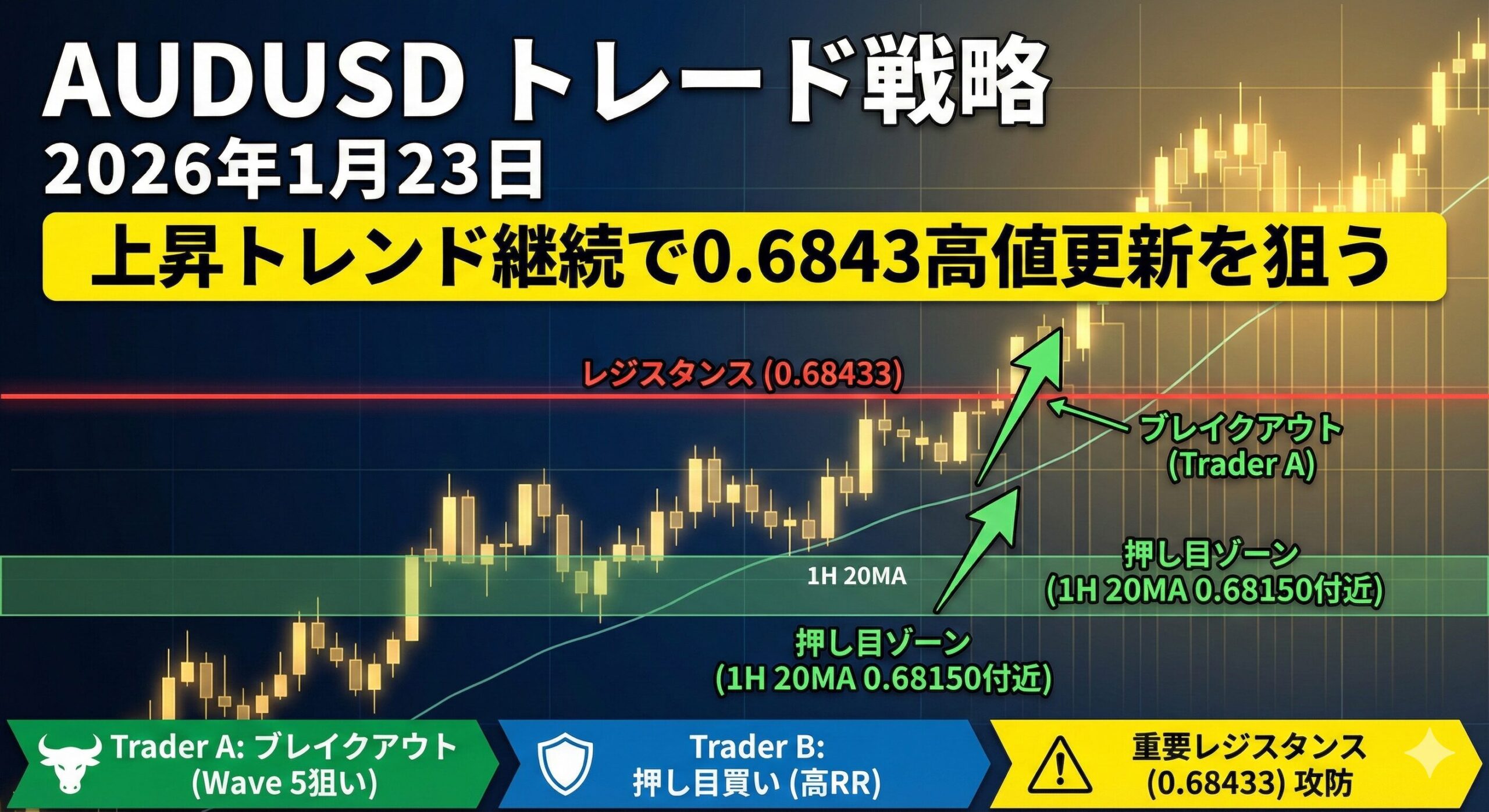 - Trader A(初動型): 直近高値0.68433ブレイクからのWave 5を狙うトレンドフォロー