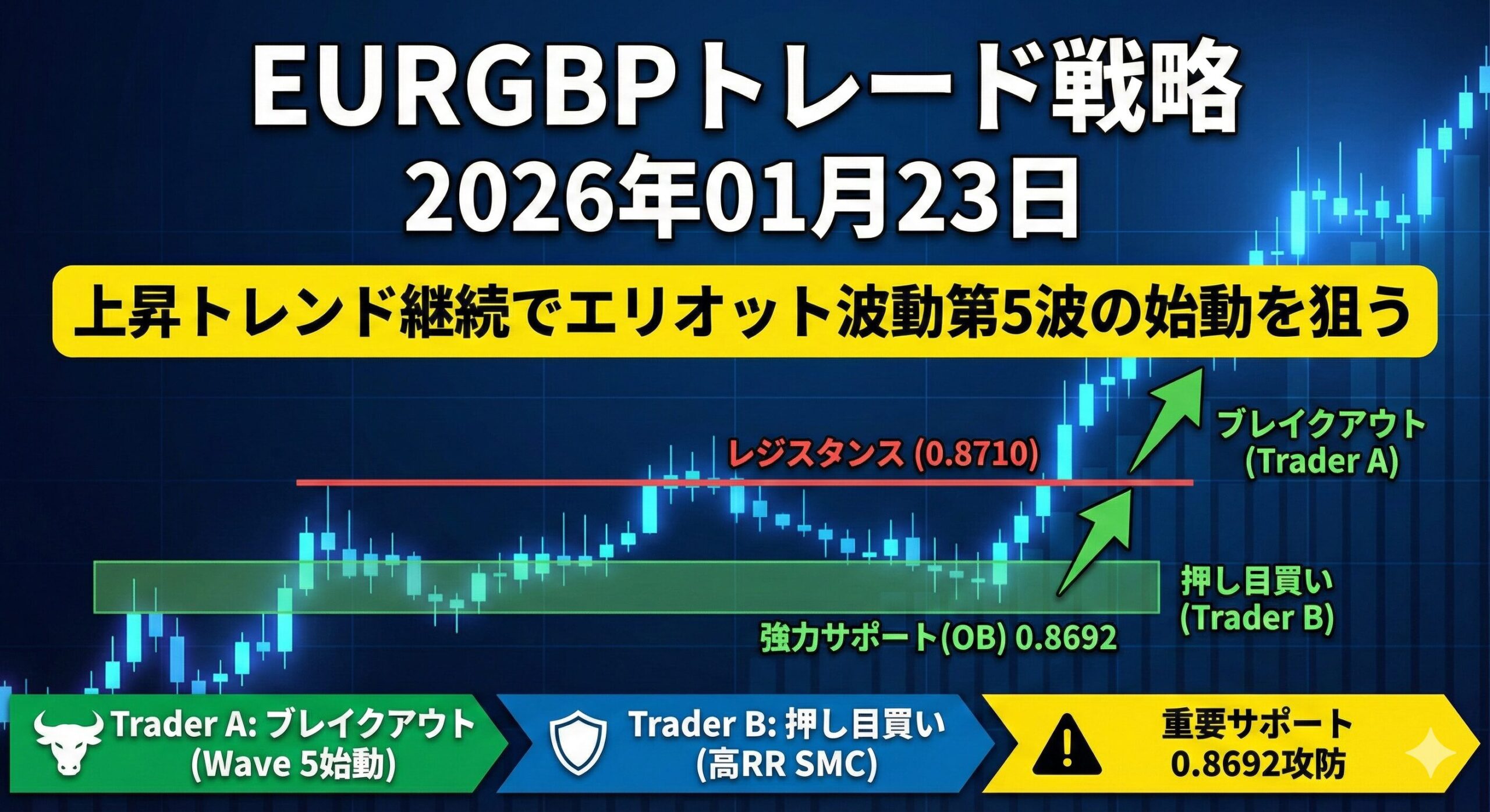 2026年01月23日のEURGBP分析。4時間足上昇トレンド継続中、0.8692の強力なサポート(オーダーブロック)に注目。Trader A/B戦略で最大RR比3.0を実現。テクニカル分析とSMC、エリオット波動を組み合わせた実践的戦略。