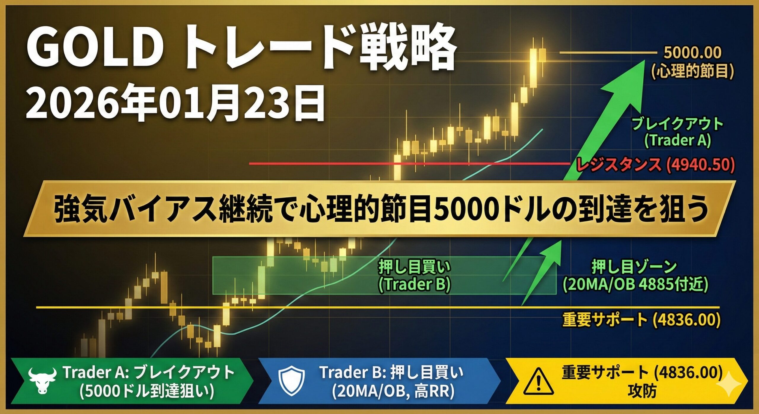 2026年01月23日のGold(XAUUSD:金スポット)について、裁量トレード×クオンツ分析の視点から戦略を立案しました。