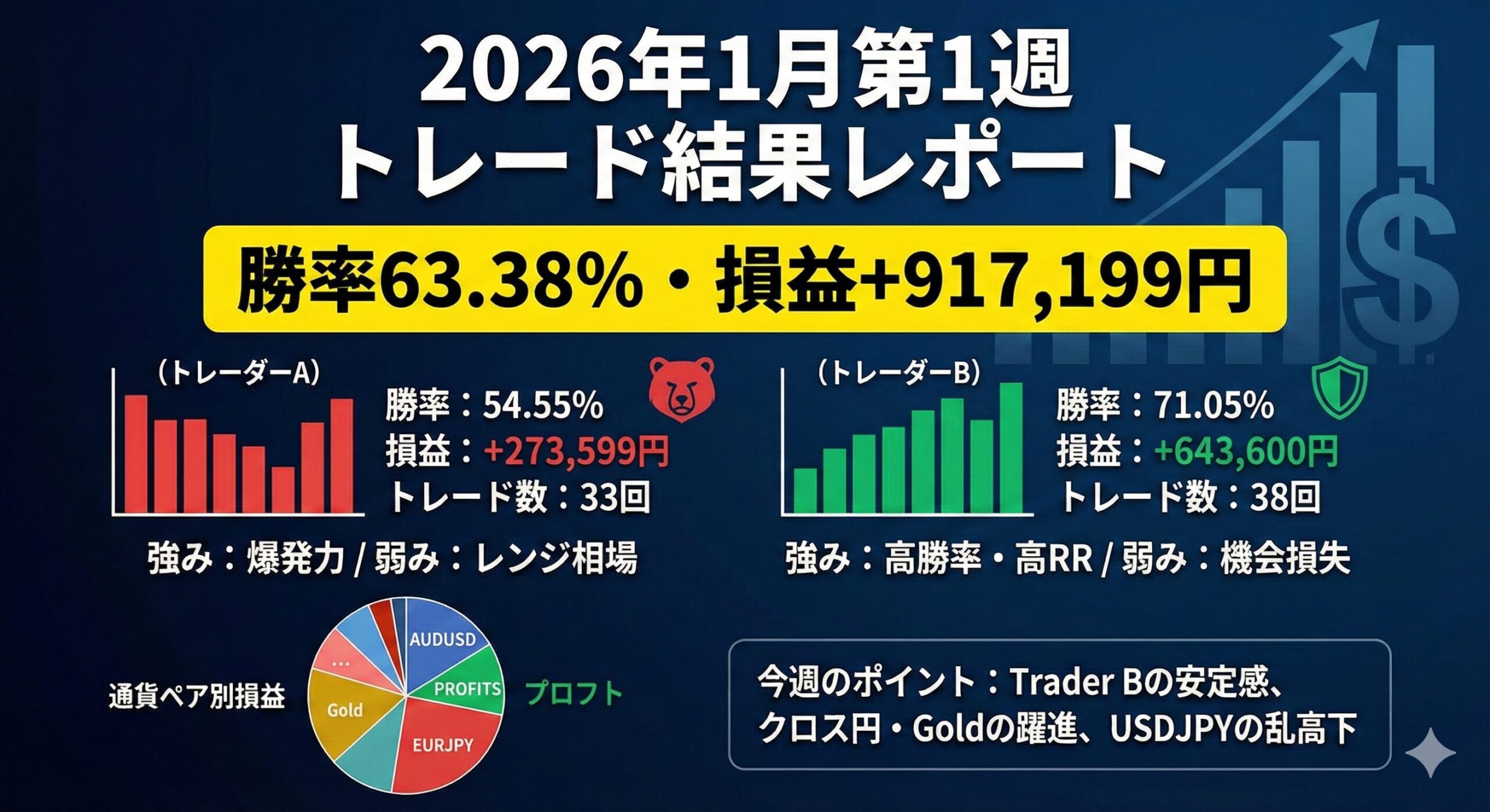 今週は**+90万円オーバー**という素晴らしい結果を残すことができました。特にTrader Bの安定感と、トレンドが出た通貨ペア(AUD, Gold, EURJPY)での利益最大化が勝因です。一方で、USDJPYのようなレンジ相場への対応という明確な課題も見えました。