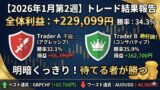 - 特にTrader Bは R:R 3.0を超えるトレード(例:1/20 GBPCHF, 1/22 EURJPY)を複数回成功させており、これが高収益の要因です。「勝率だけでなく、勝った時の利益額」がいかに重要かがわかります。