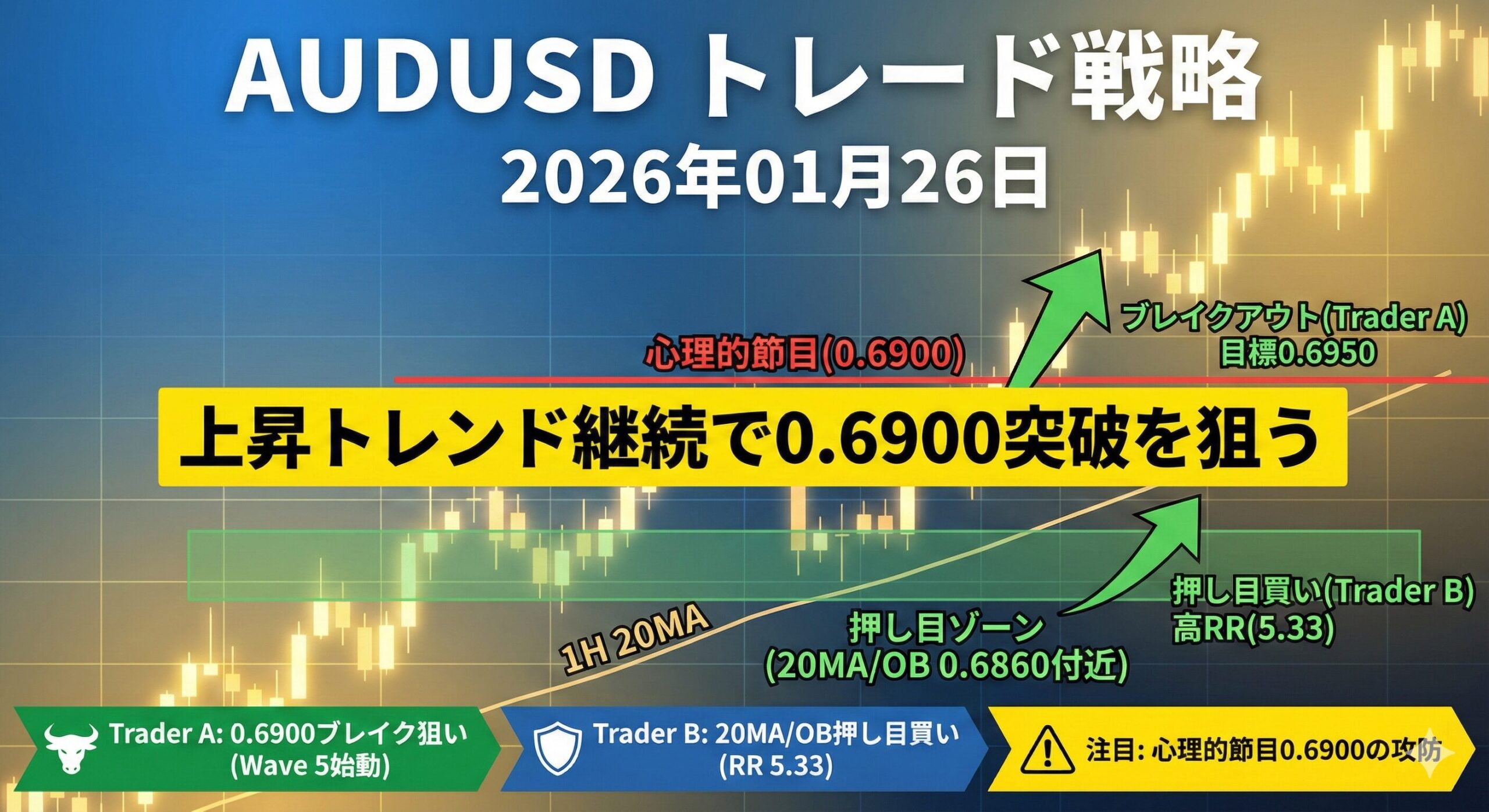 2026年01月26日のAUDUSD分析。上昇トレンド継続中、心理的節目0.6900のブレイクと20MA押し目買いに注目。Trader A/B戦略で最大RR比5.33を実現。テクニカル分析に基づく実践的戦略。