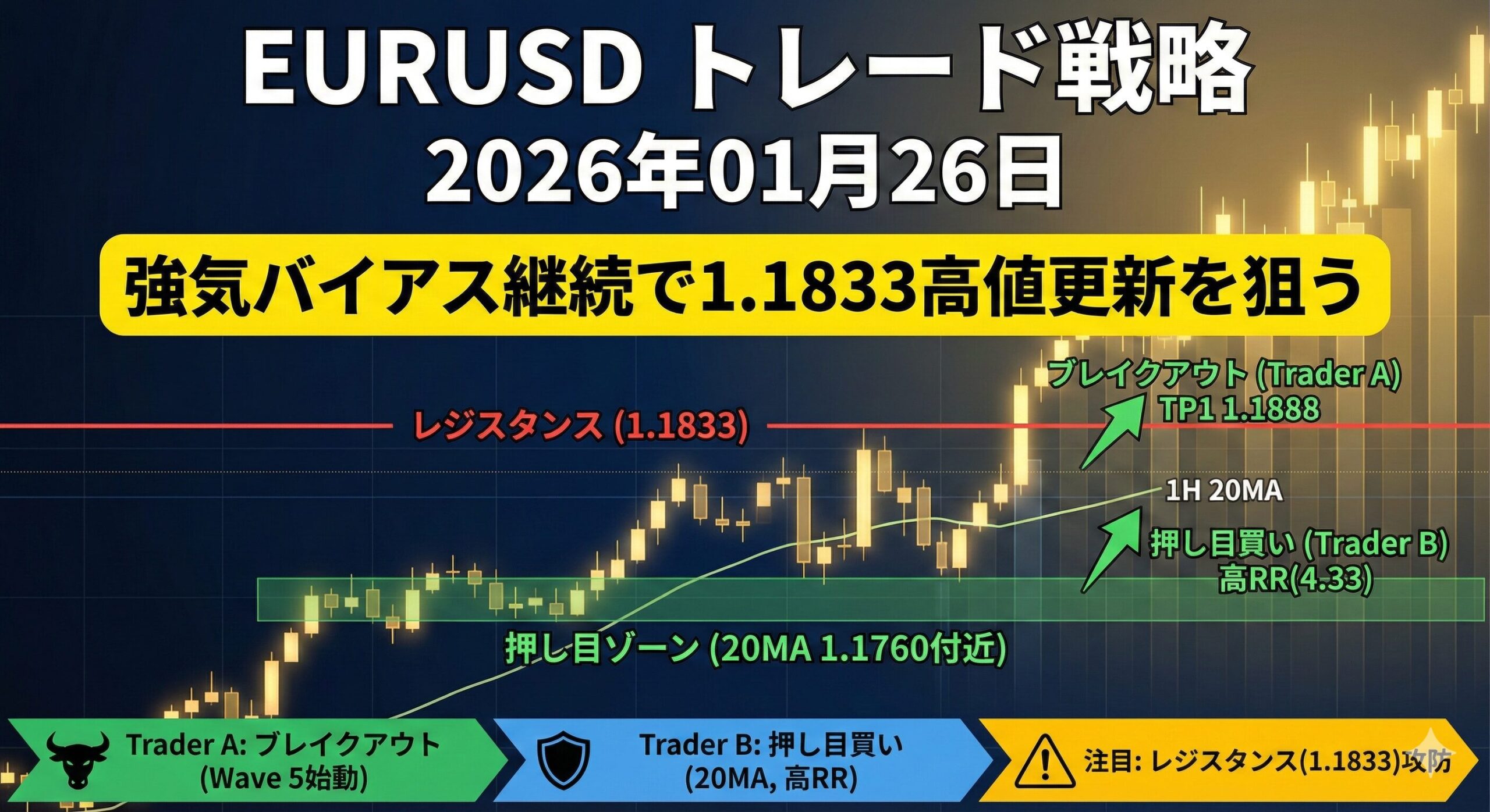 2026年01月26日のEURUSD分析。上昇トレンド継続中、1.1833のレジスタンス突破と20MAへの押し目買いに注目。Trader A/B戦略で最大RR比4.33を実現。テクニカル分析に基づく実践的戦略。