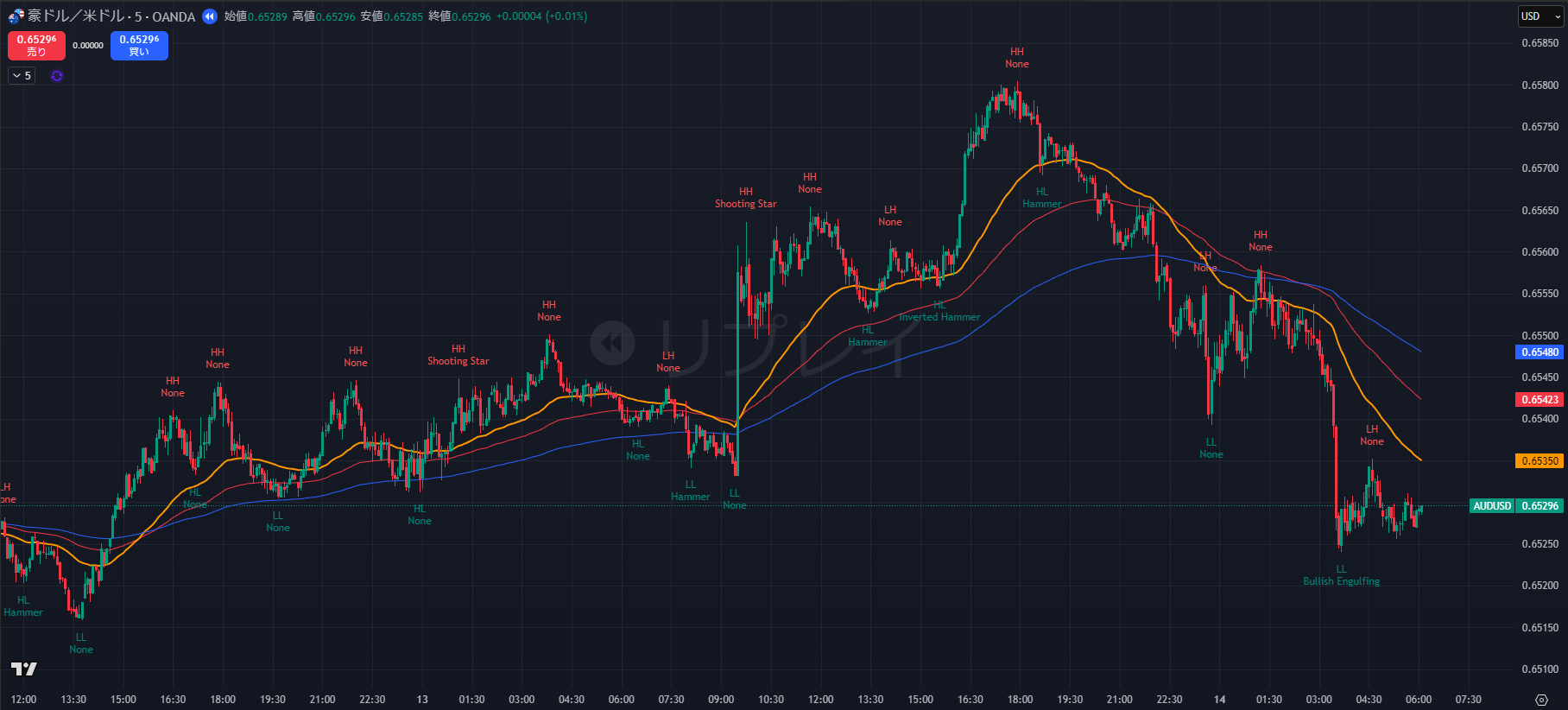 - 価格が 0.6520 ~ 0.6525 まで落ちてきた際、5分足で「長い下ヒゲ」または「陽線の包み足」を確認してエントリー。