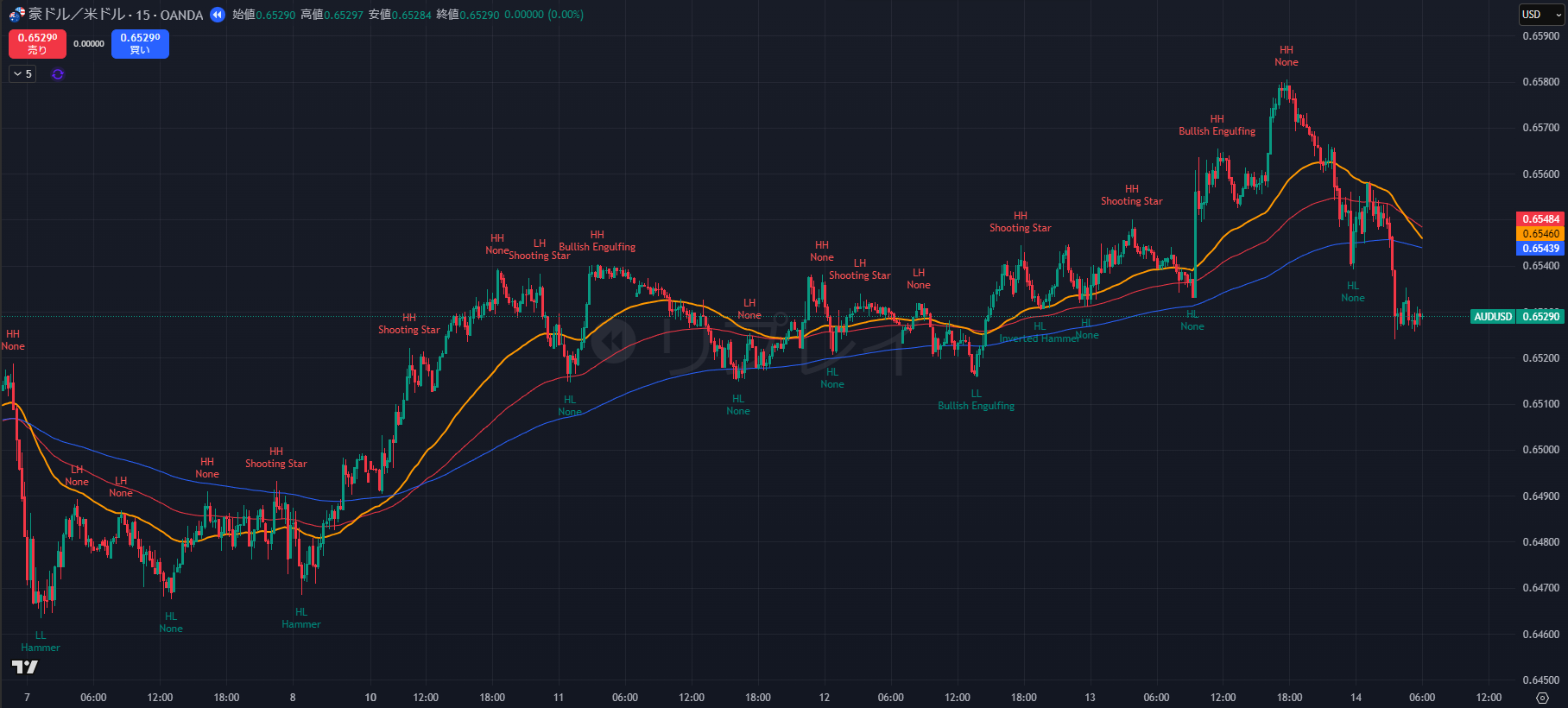 - 15分足以下では、0.6578からの下落により高値・安値を切り下げる下降トレンドが発生しています。