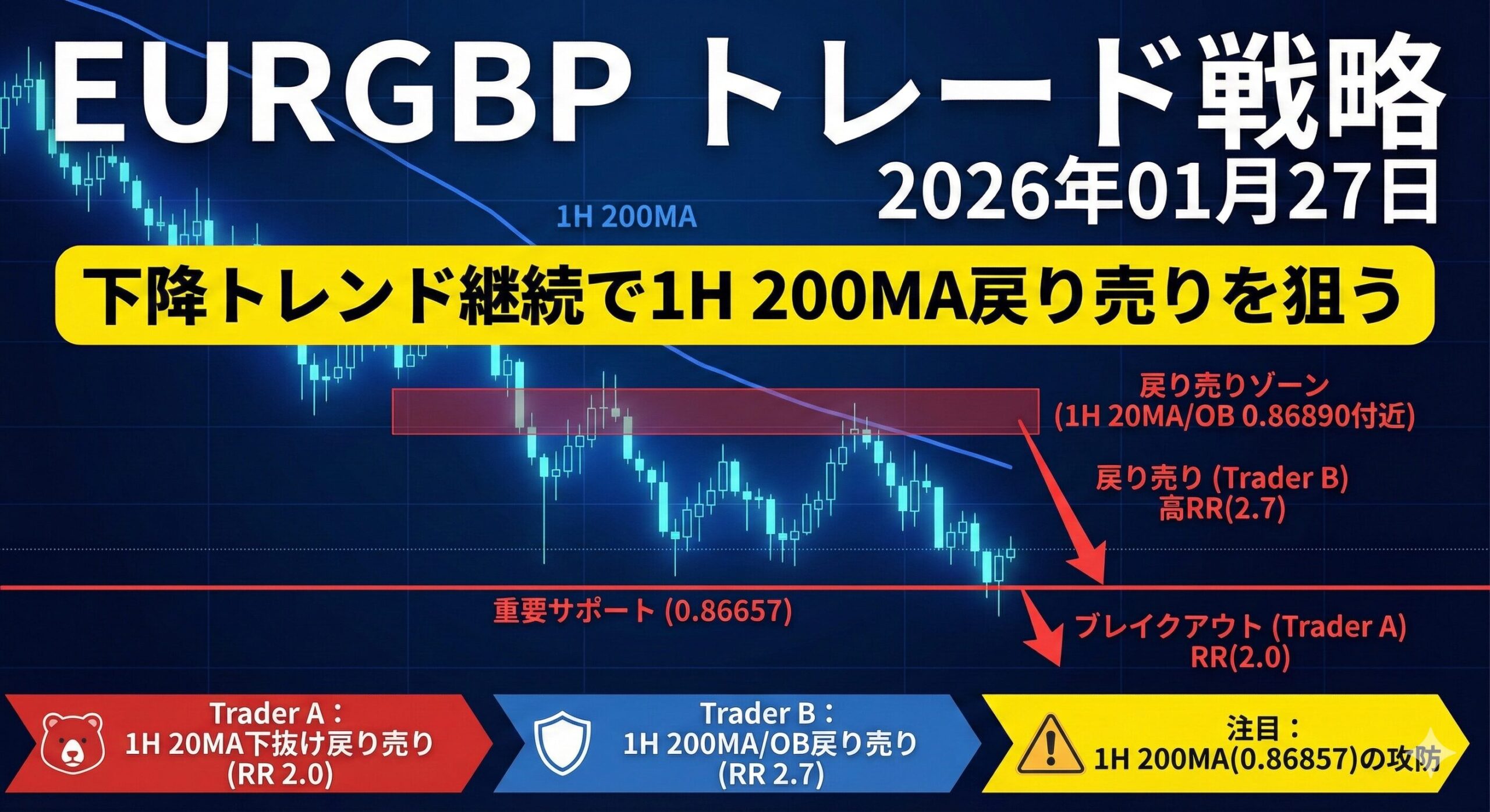 2026年01月27日のEURGBP分析。下降トレンド継続中、1H 200MA戻り売りに注目。Trader A/B戦略でRR比最大2.7を実現。テクニカル分析に基づく実践的戦略。