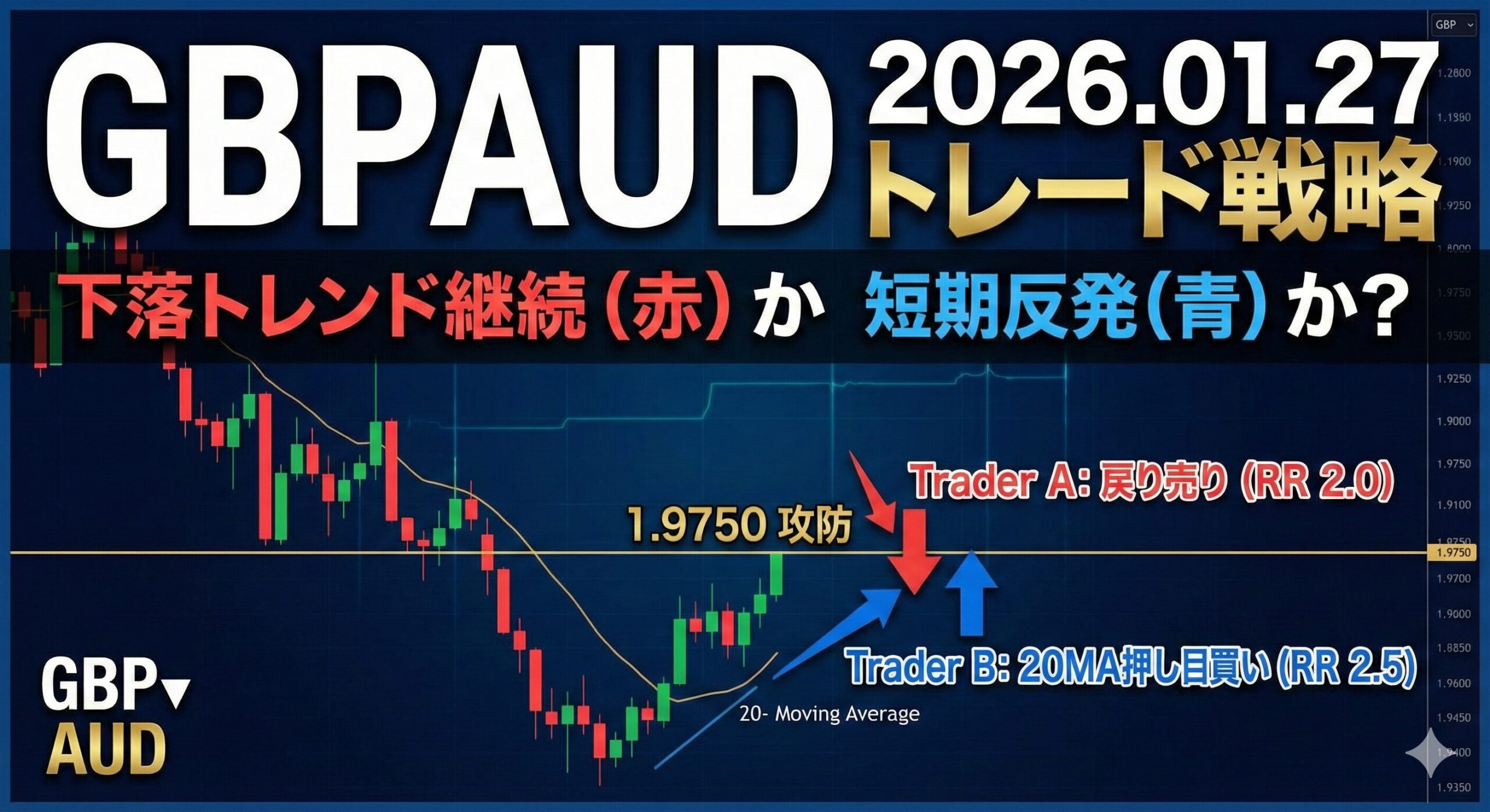 2026年01月27日のGBPAUD分析。4時間足は下降トレンド継続中、1時間足は短期反発局面。Trader A(戻り売り)とTrader B(押し目買い)の両面戦略で最大RR比2.5を実現。テクニカル分析に基づく実践的戦略。