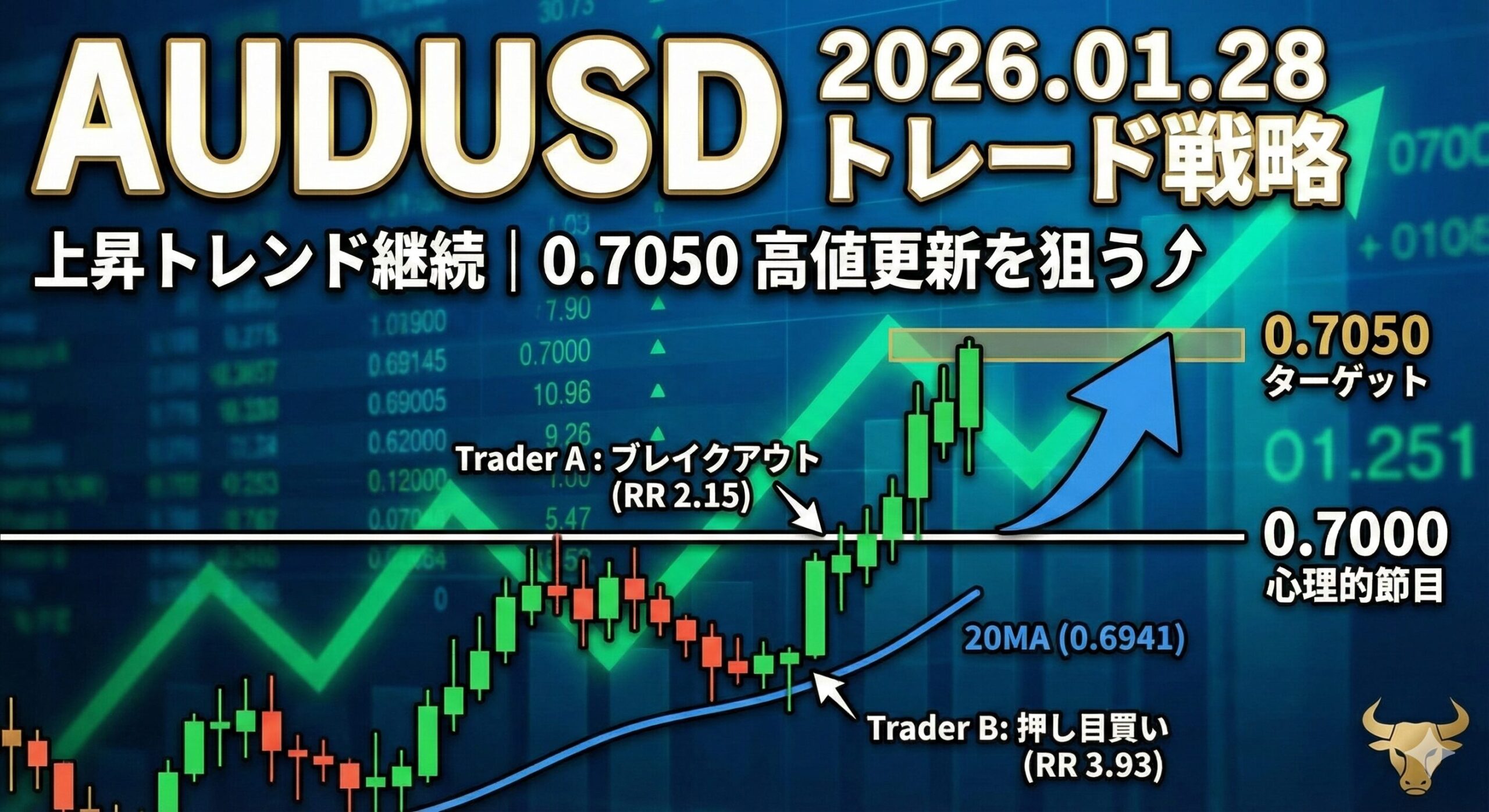 2026年01月28日のAUDUSD分析。上昇トレンド継続中、0.7000心理的節目の突破に注目。Trader A/B戦略で最大RR比3.93を実現。テクニカル分析に基づく実践的戦略。