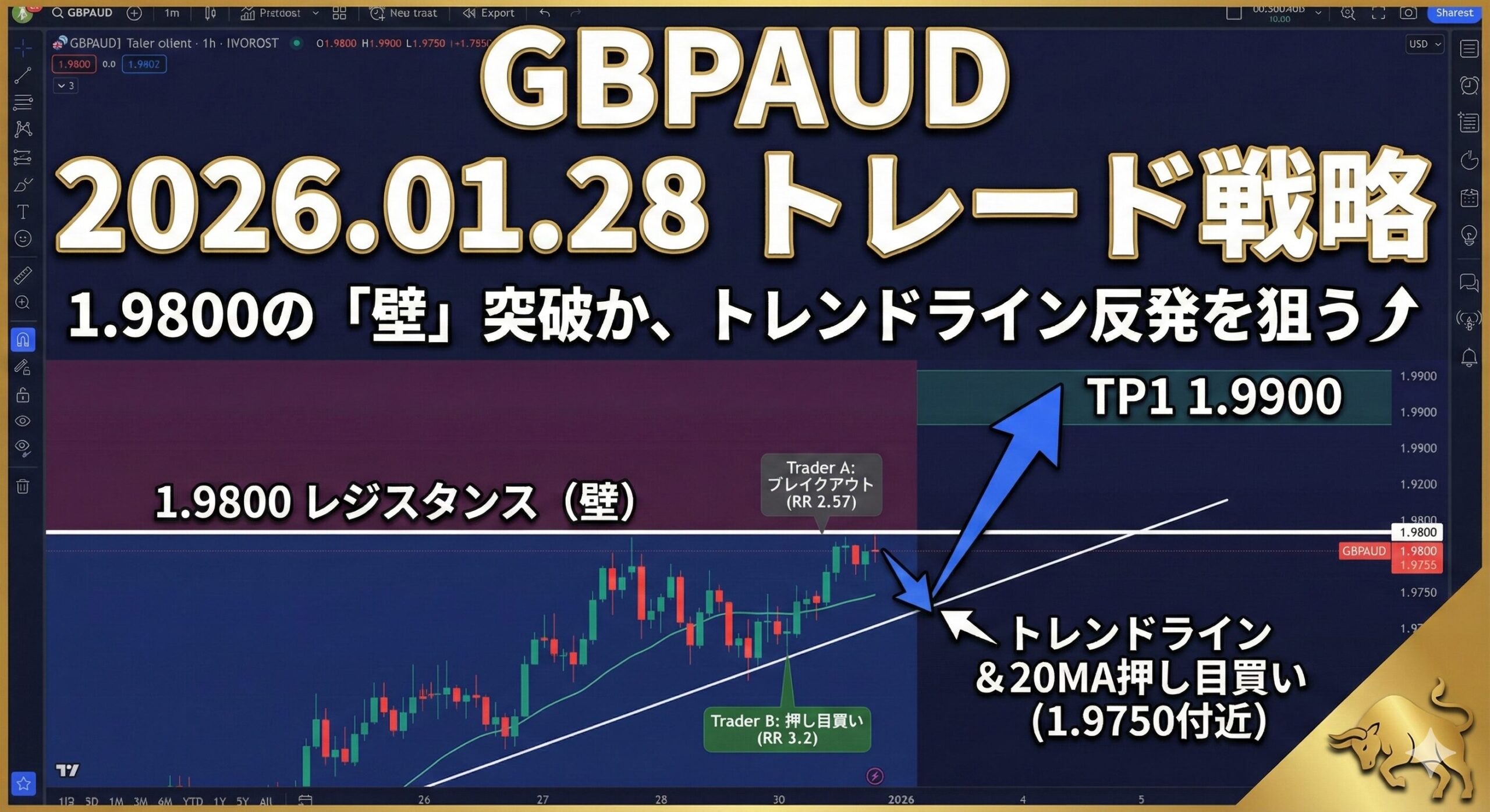 2026年01月28日のGBPAUD分析。4時間足上昇トレンド継続中、1.9800の強力レジスタンス突破に注目。Trader A/B戦略で最大RR比3.2を実現。テクニカル分析に基づく実践的戦略。