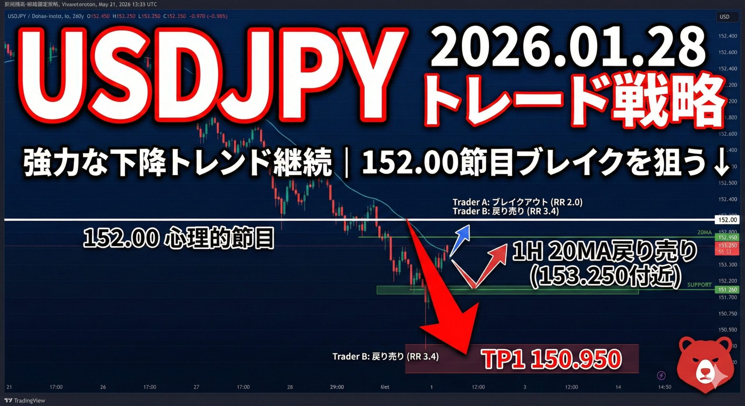 - Trader A(初動型): 152.000の心理的節目ブレイク、または直近急落後の安値更新を狙うアグレッシブな売り戦略
