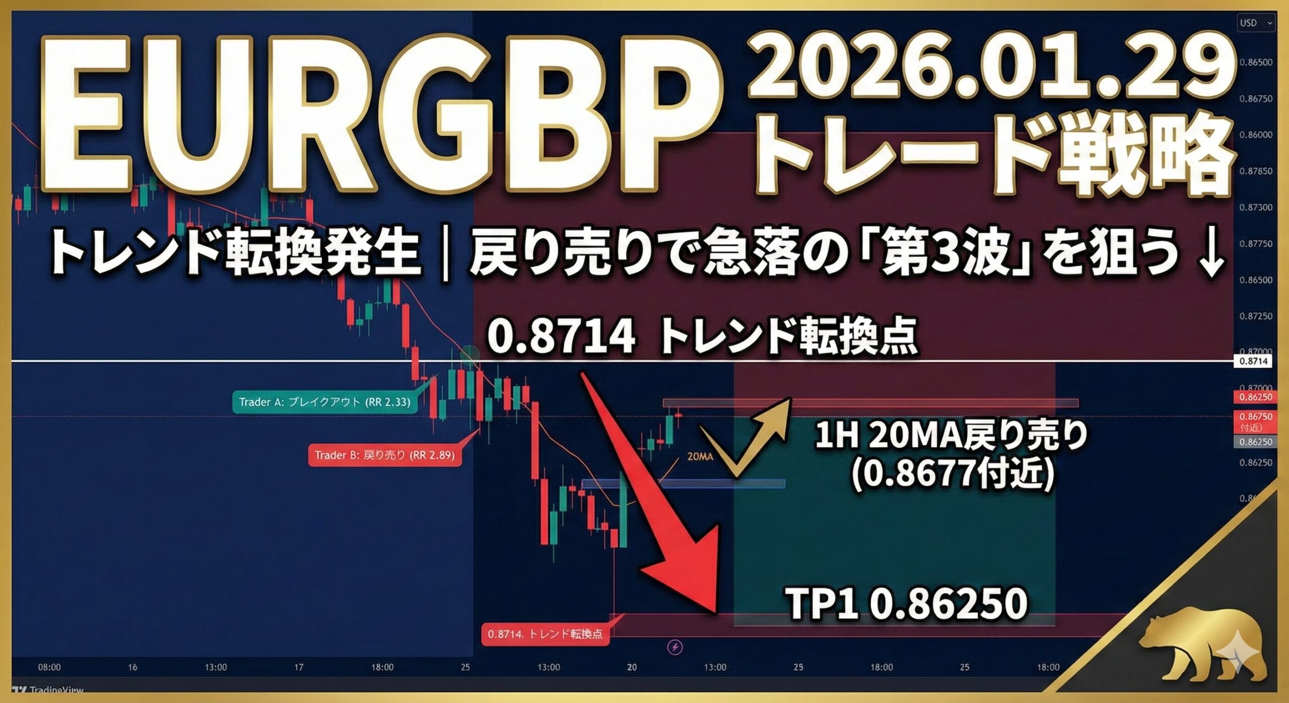 2026年01月29日のEURGBP分析。0.8714からの急落により下降トレンドへ転換。FVGおよび20MAでの戻り売りに注目し、Trader A/B戦略で最大RR比2.89を実現。テクニカル分析に基づく実践的戦略。