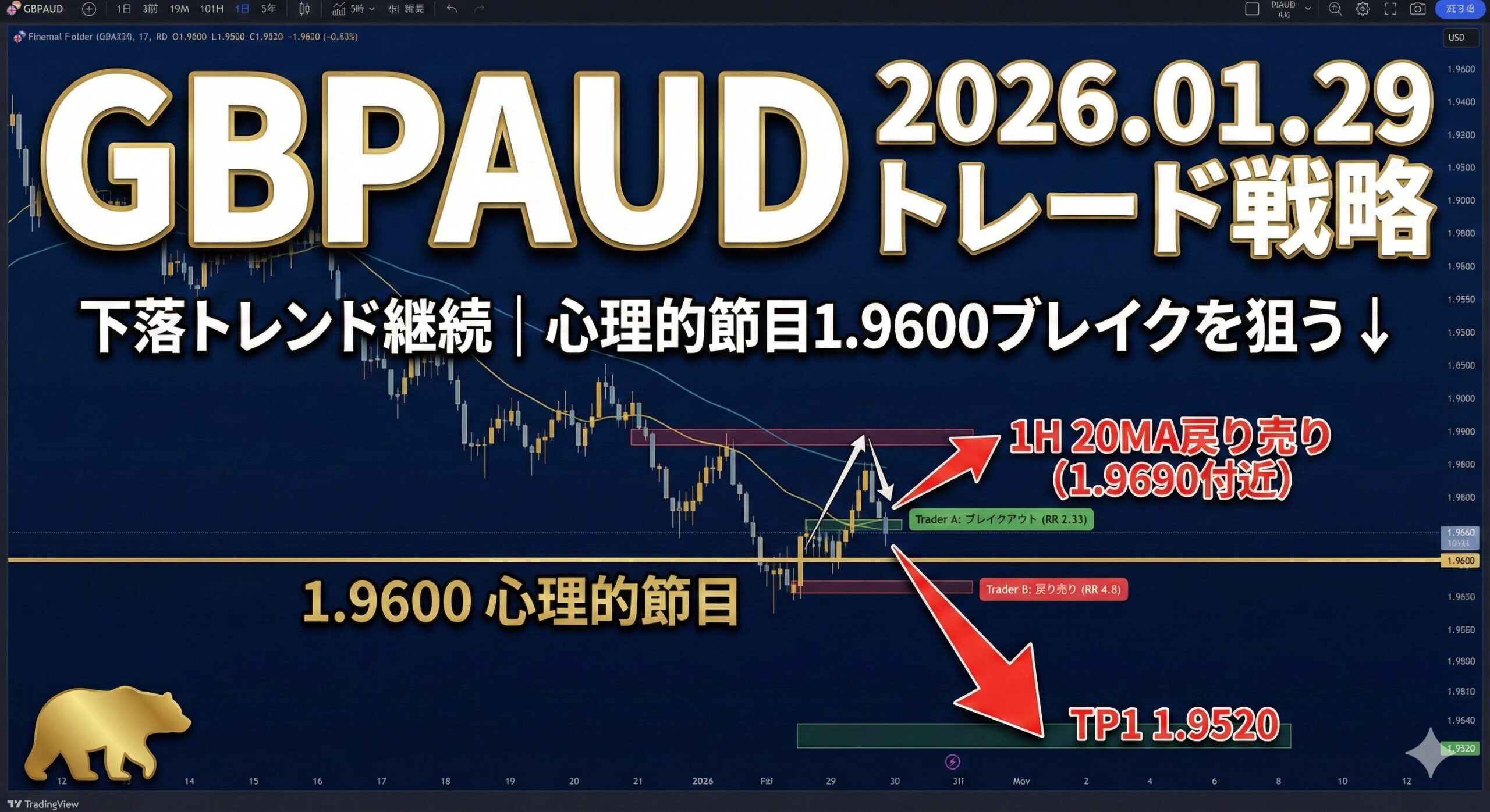 今日の市場はベア(弱気)バイアスが非常に強く、特に心理的節目である1.9600の攻防に注目が集まっています。