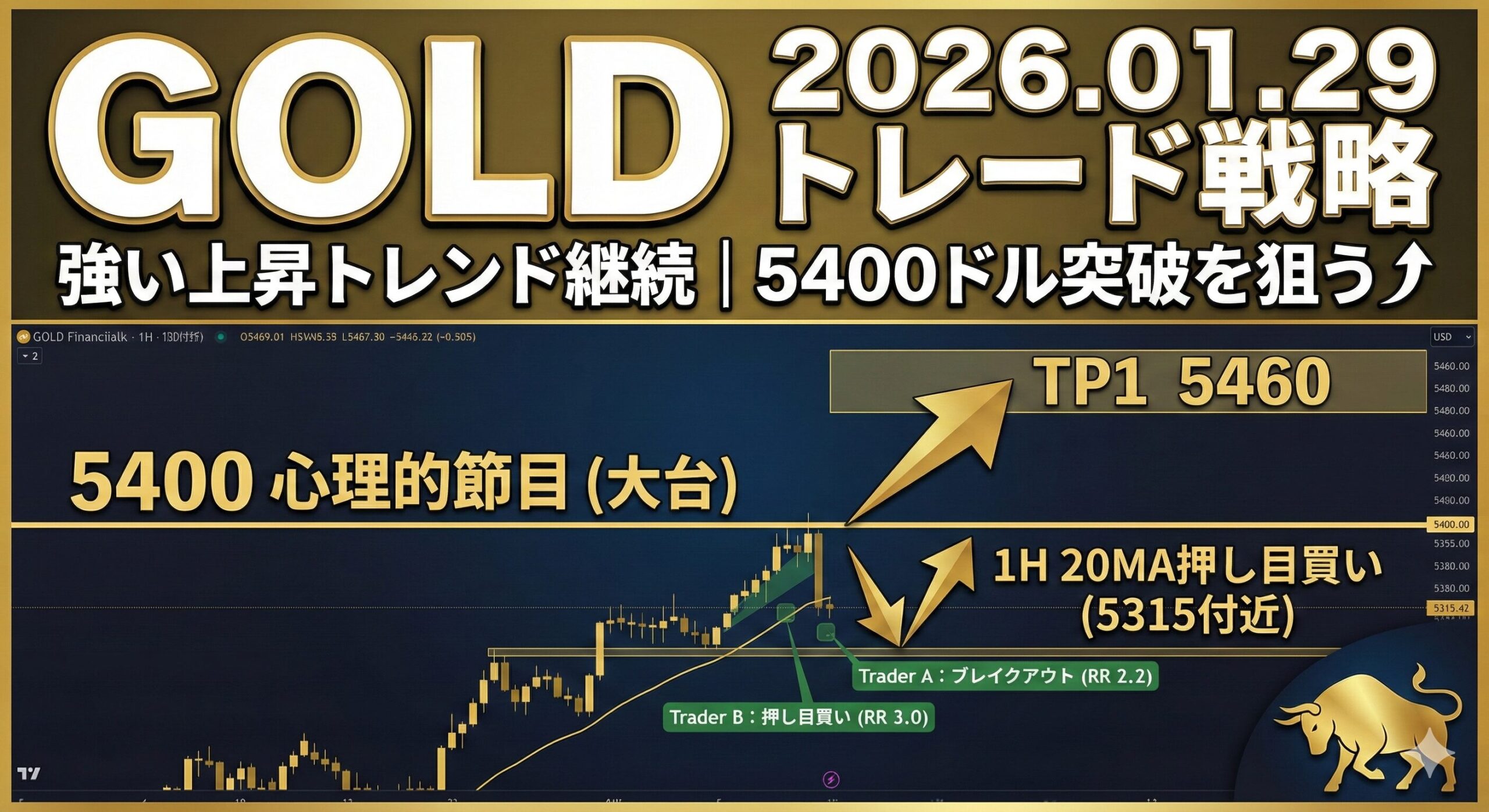 - Trader A(初動型): 5400.00ドルの節目ブレイクを狙うアグレッシブな追随戦略