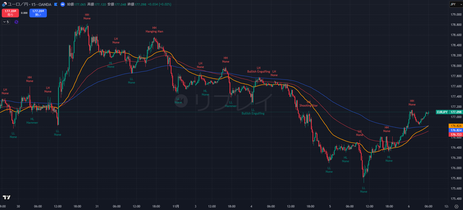 - Major Swings: 11月1日の高値 178.61 を起点に、高値を切り下げ(LH)、安値も 176.35 まで更新(LL)しています。