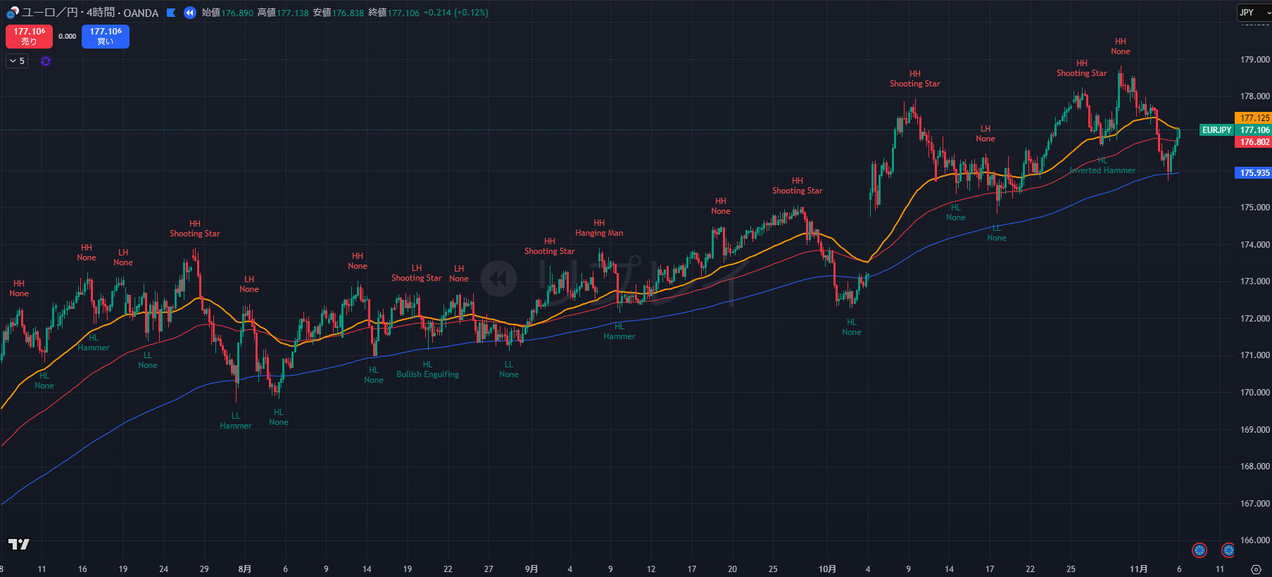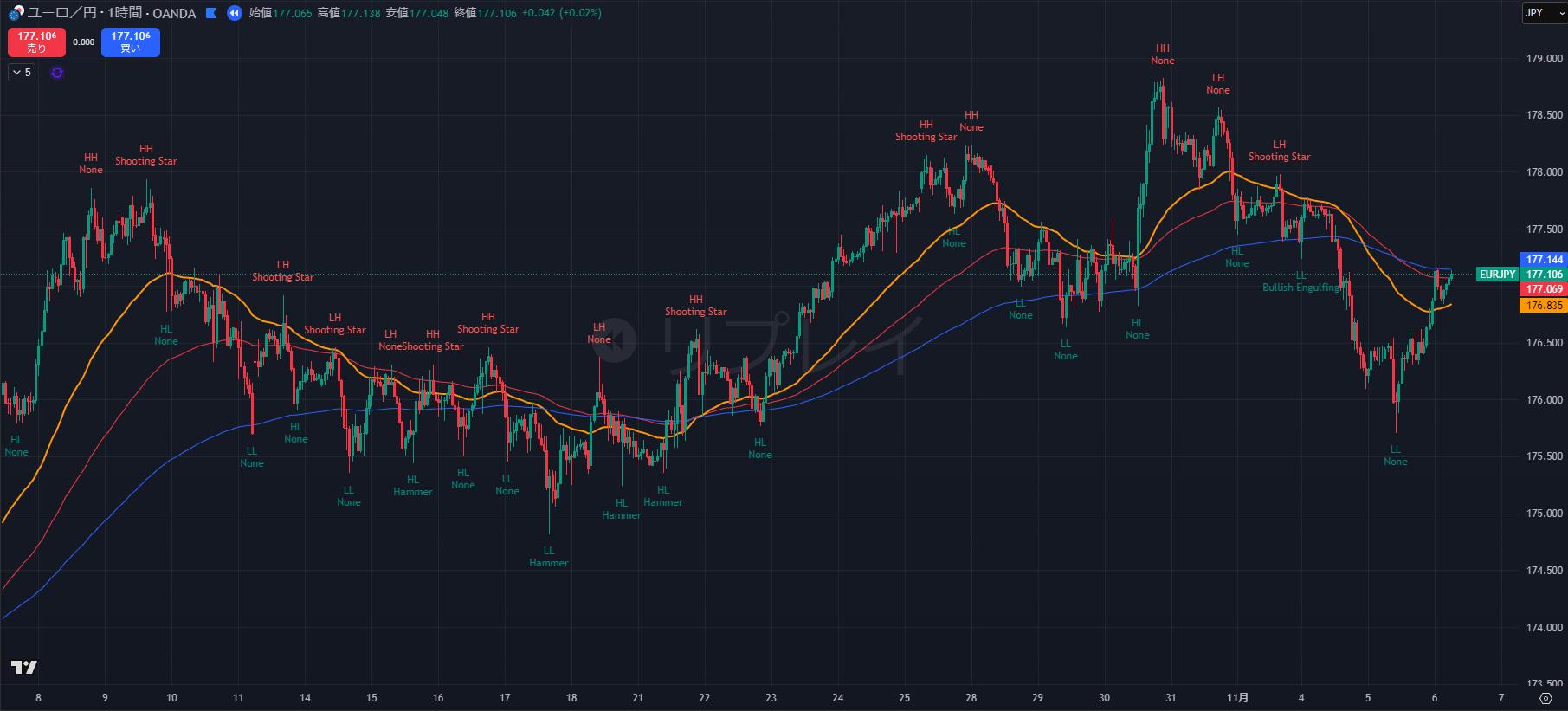 - 177.09 (今朝の高値) が直近のレジスタンスです。ここを実体で抜けきれずに長い上ヒゲが出れば、売りのサインとなります。