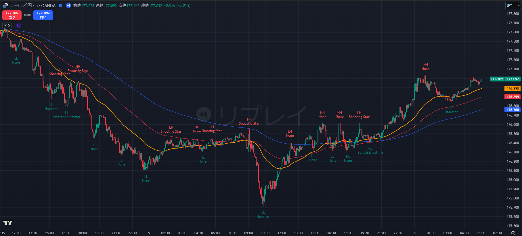 - 包み足・ピンバー: 5分足で177.10付近にタッチした際に「長い上ヒゲ」や「陰線の包み足」が出現すれば、昨日のポジションへの「増し玉」または「再エントリー」の好機です。