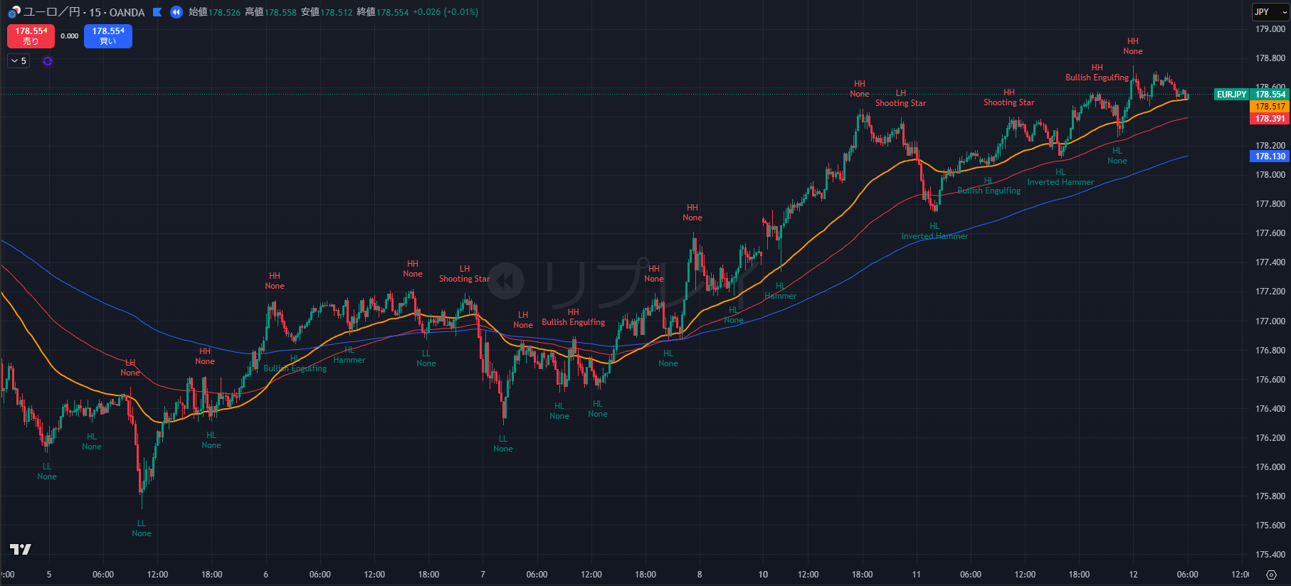 - 下落しても 178.40 付近ですぐに下ヒゲを出して買われる動きが続いており、買い意欲の強さが伺えます。