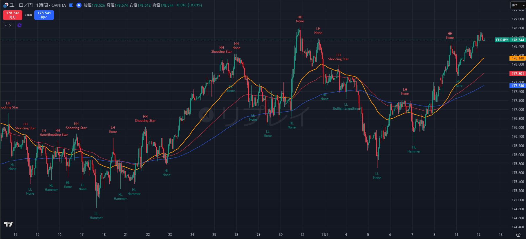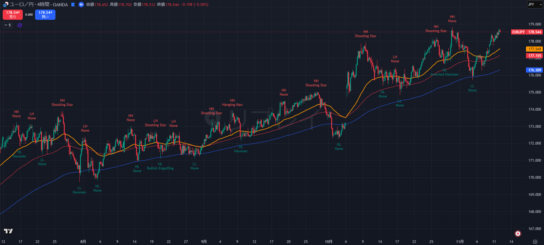 - 4時間足では、直近高値を 178.519 (11/11 18:00) で更新し、安値も 177.33 (11/11 07:00) から切り上げています。明確な
