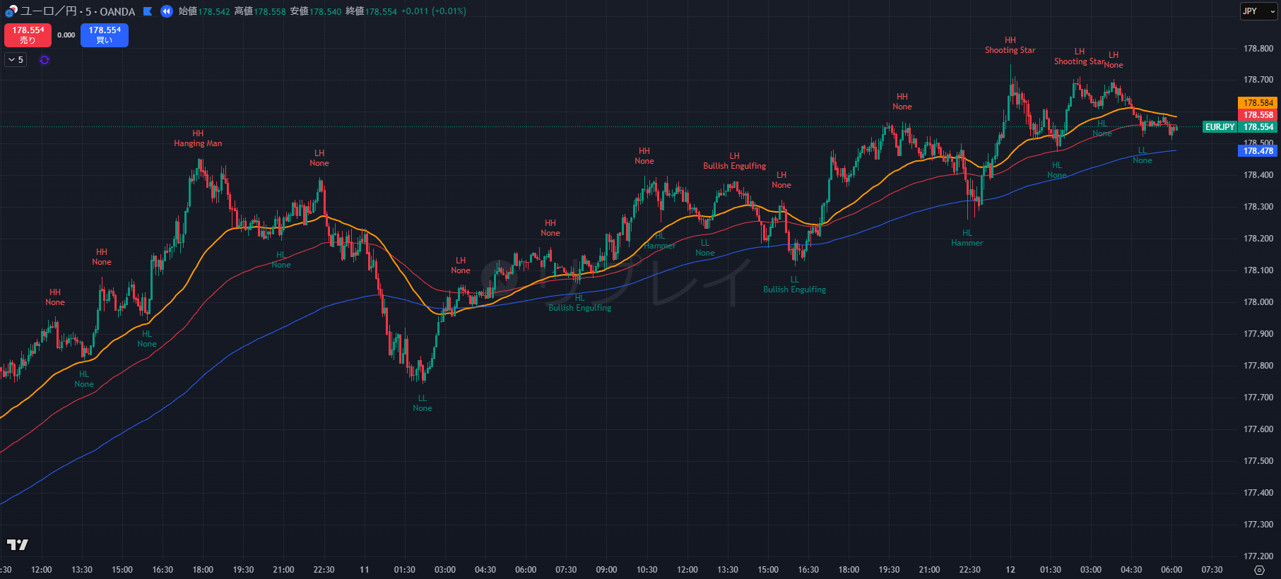 価格がエントリーゾーン(178.20-35)まで落ちてきた際、5分足で以下のプライスアクションを確認してエントリーします。