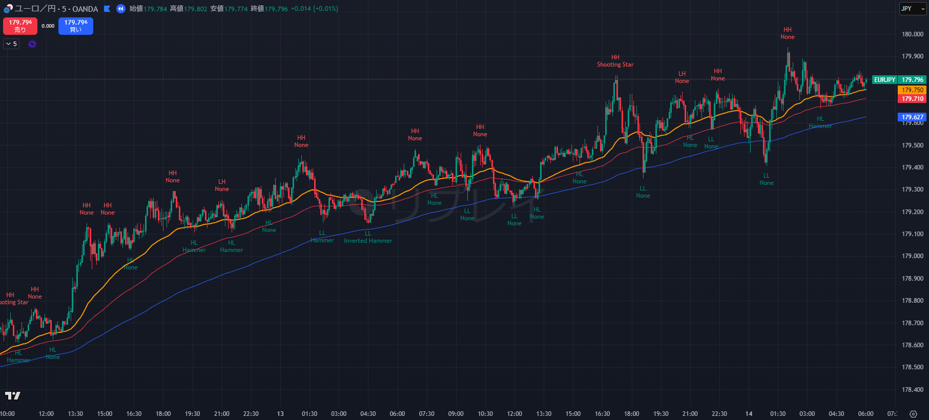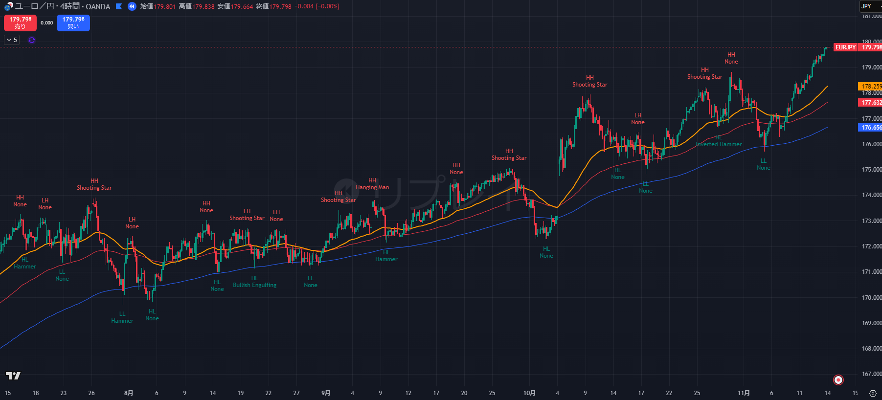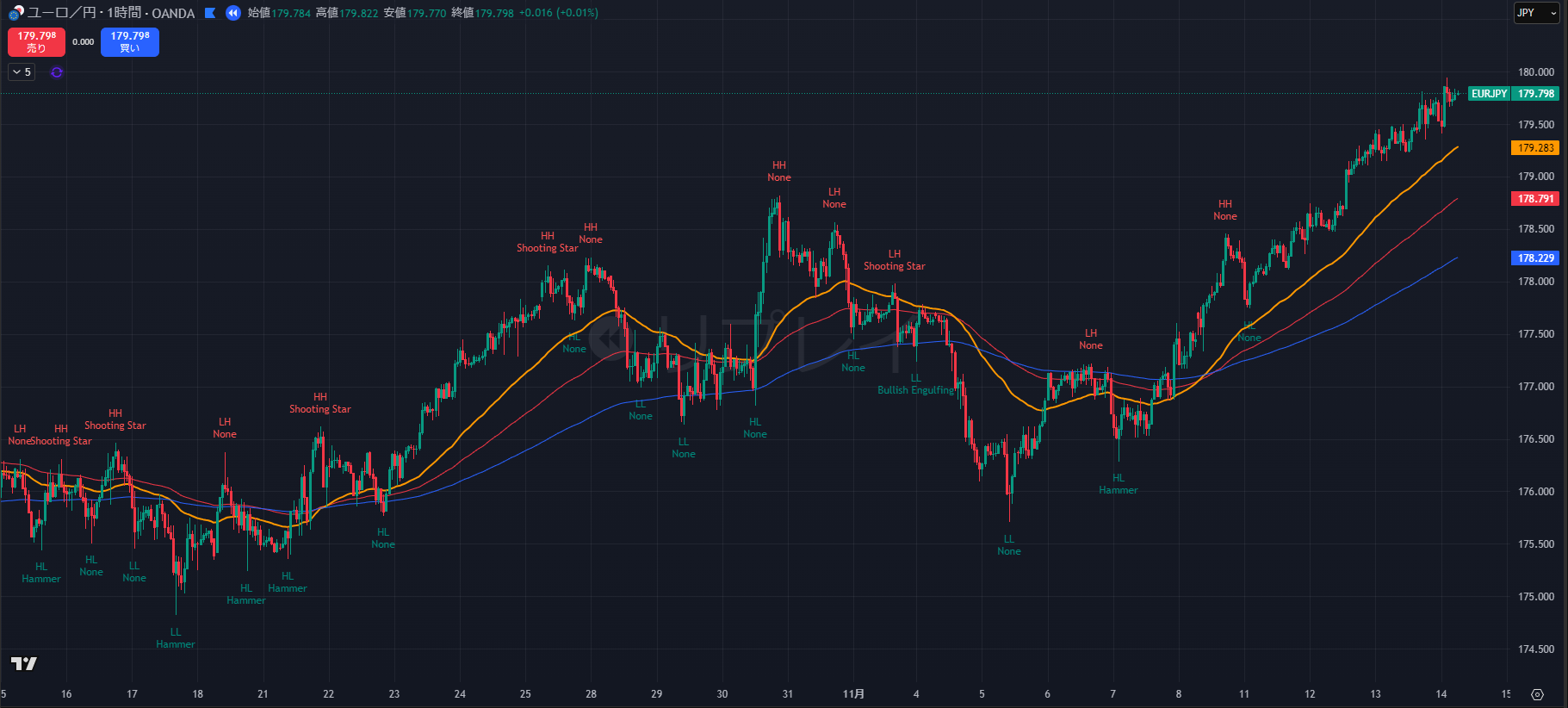 - 詳細: 11/13の最安値は 179.032 であり、指値注文(178.95)はヒットしませんでした。その後、価格は順調に上昇し、TPターゲットである 179.35 を大きく超え、一時 179.80 台まで到達しました。