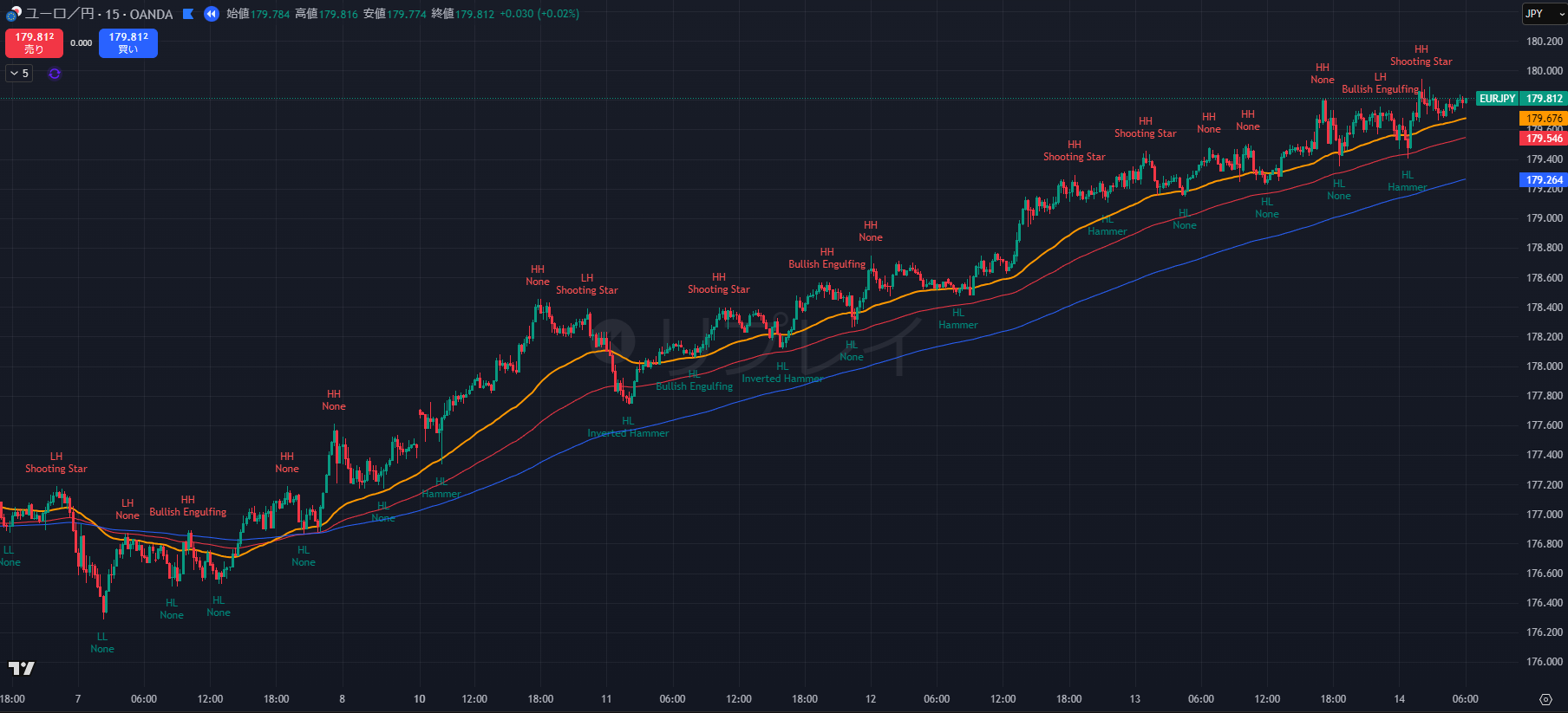 - 高値更新 (HH): 直近高値 179.35 をブレイクし、179.83 まで到達。