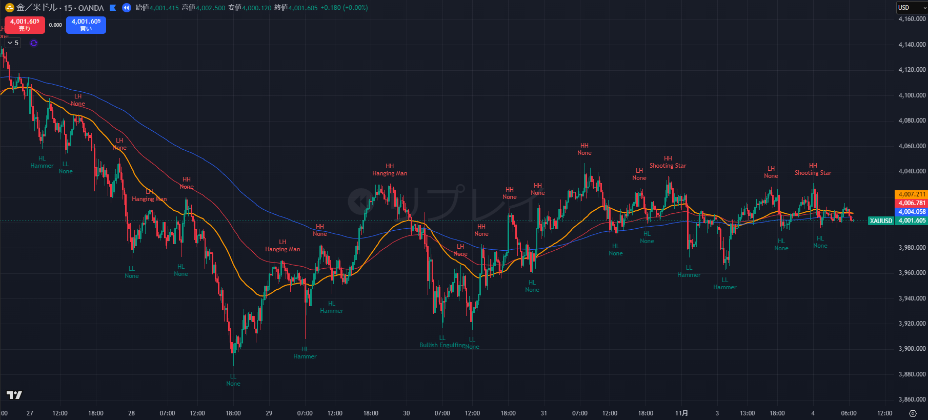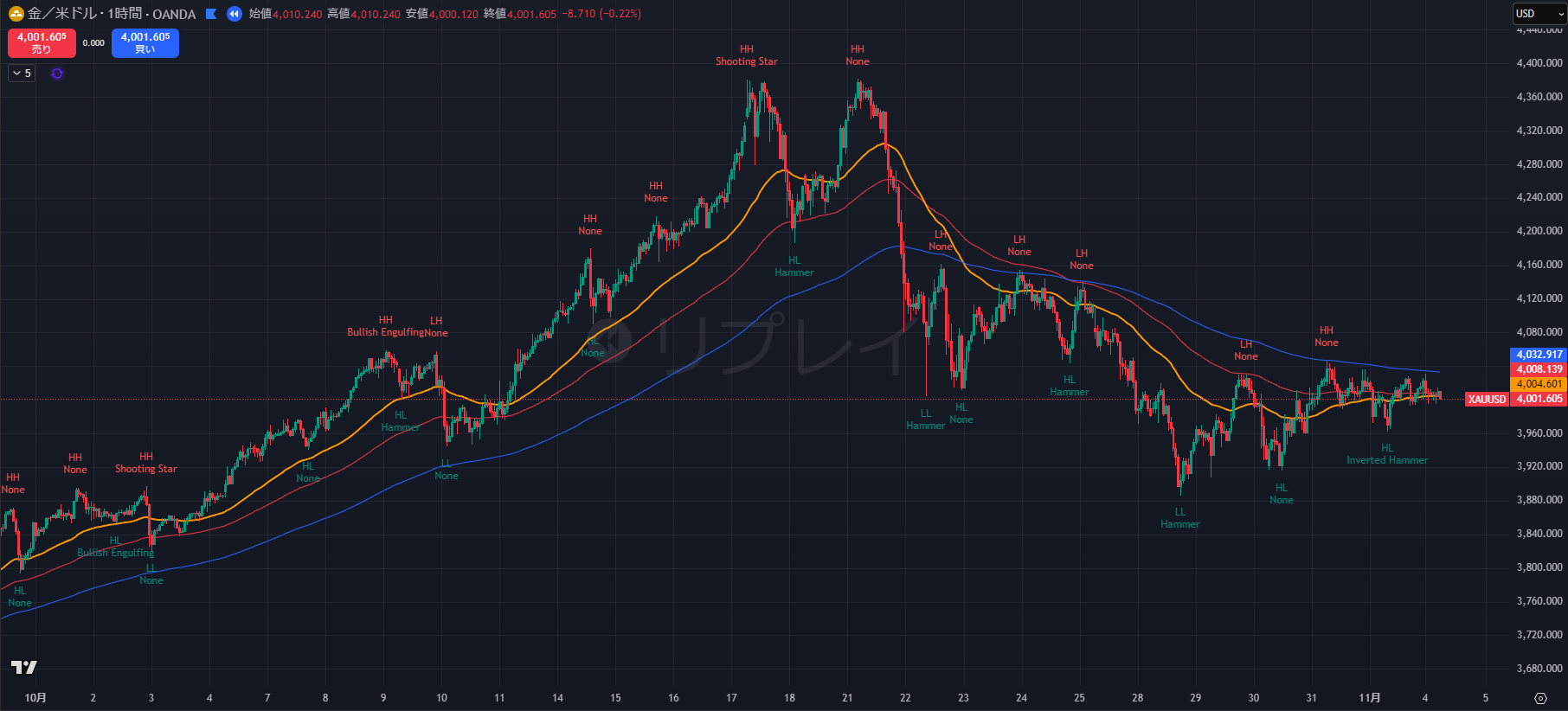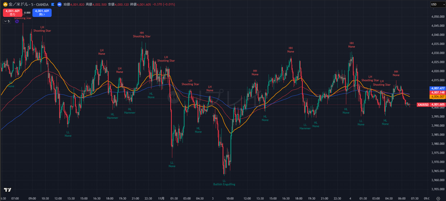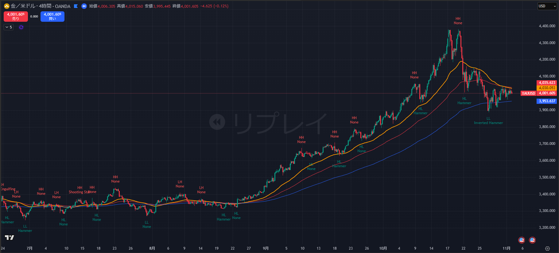 - 4001ドル付近で再びローソク足が小さくなっており、買い手の利確と新規の戻り売り注文が交錯しています。