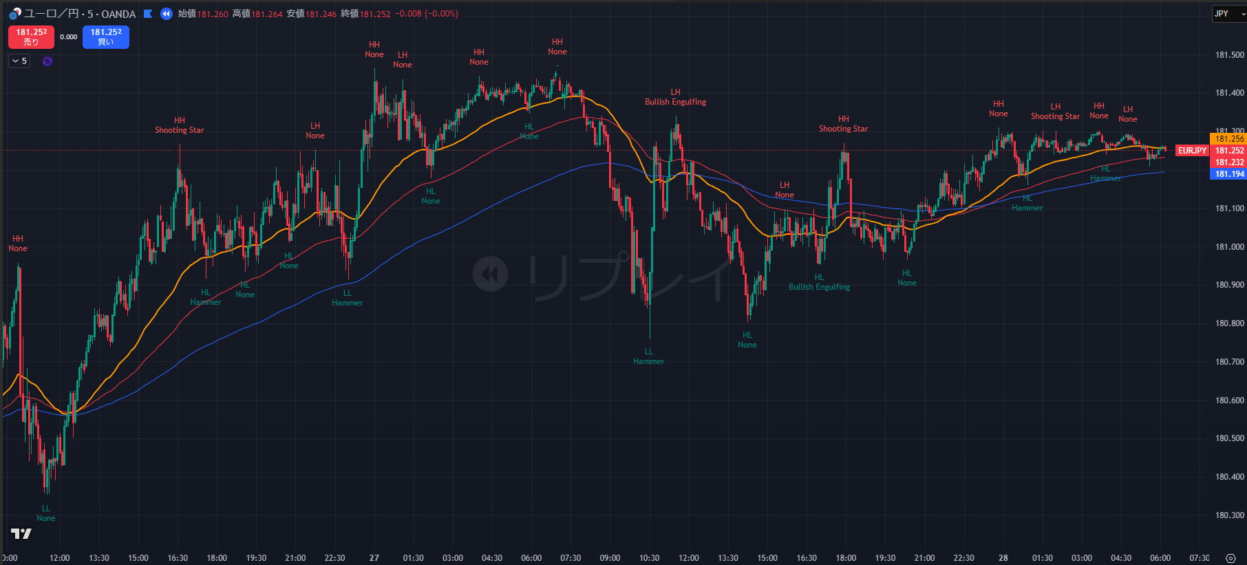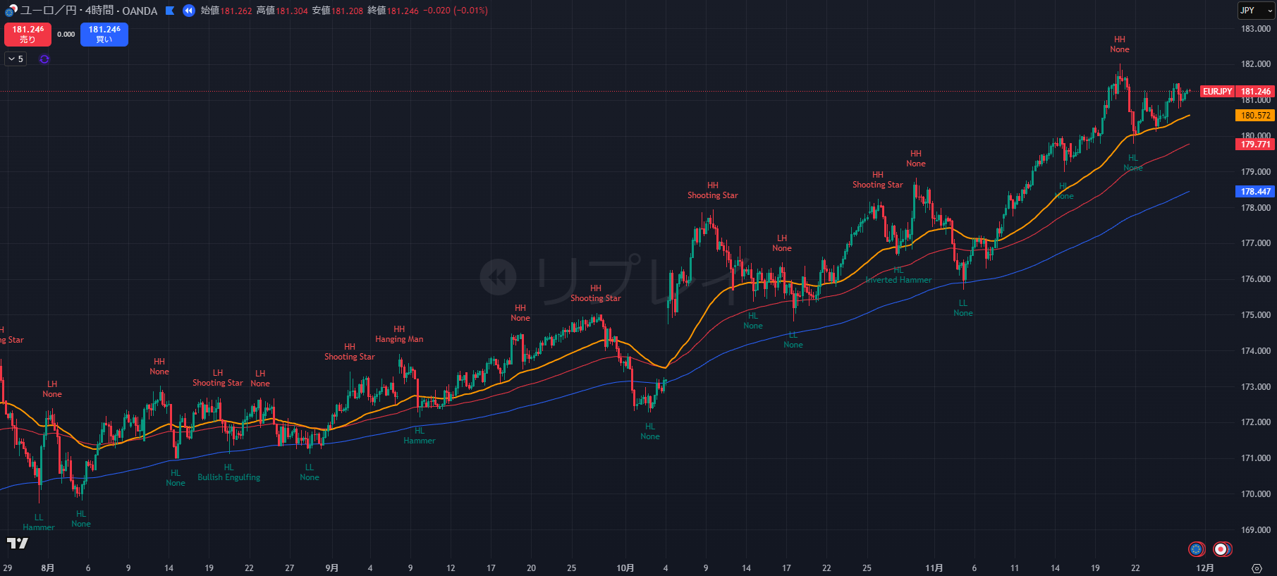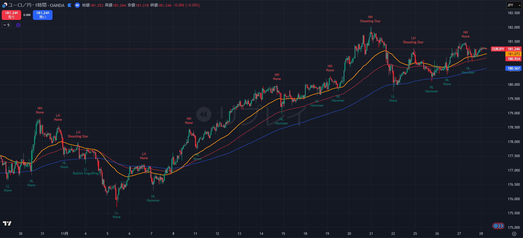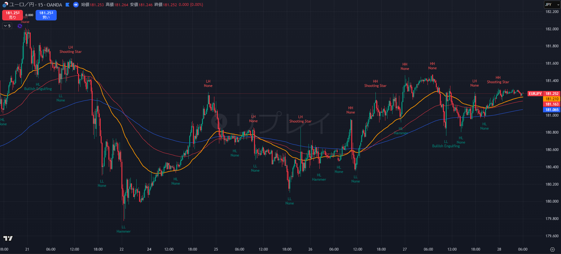 - 直近では 181.26 付近の高値圏に張り付いており、181.30 を明確に実体でブレイクできるかが焦点です。