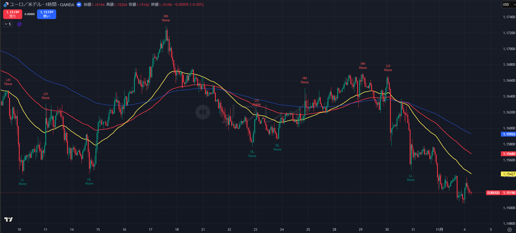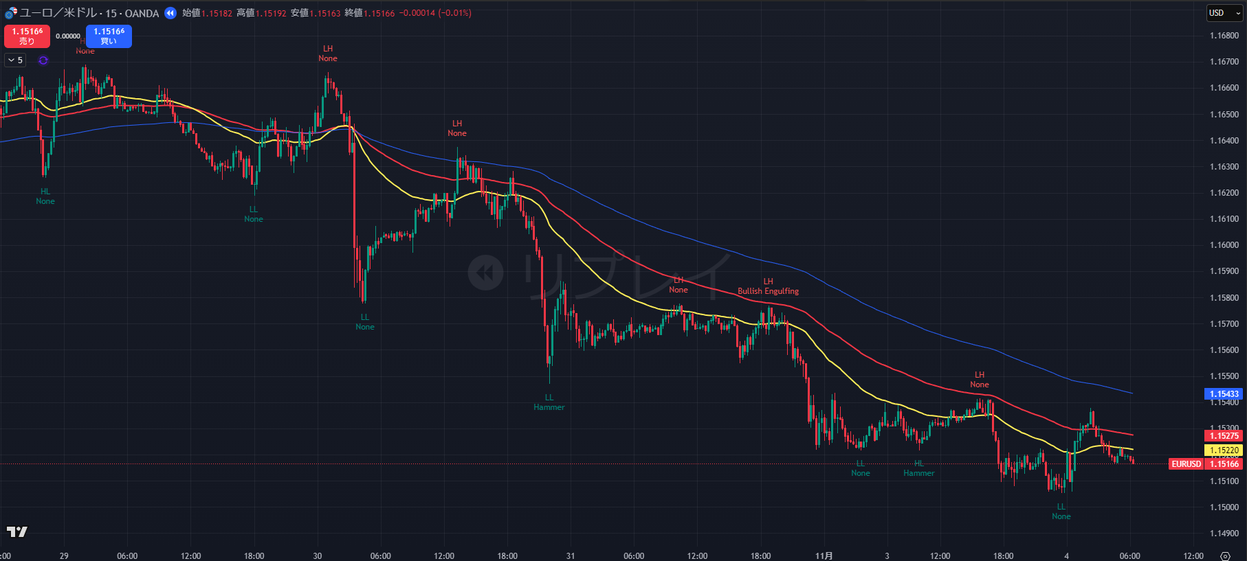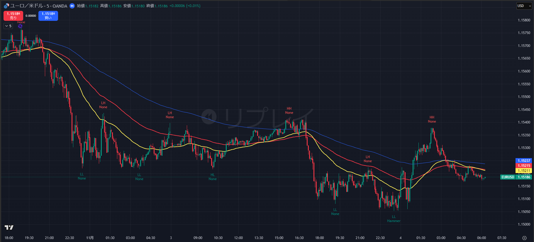- 1.1510付近へのアタック回数が増えており、サポートが弱まってきています。5分足のEMA(指数平滑移動平均線)も価格の上に覆いかぶさり始めており、下落圧力の強まりを示唆しています。
