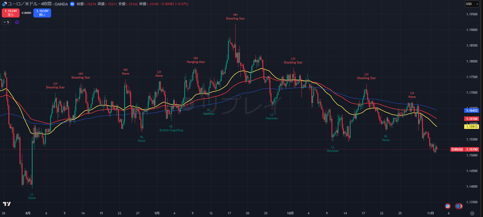 - トレンドライン理論値: 10月からの下降トレンドラインの現在値は 1.1550 – 1.1555 付近に位置しており、現在価格(1.1520)のすぐ上に蓋をしています。