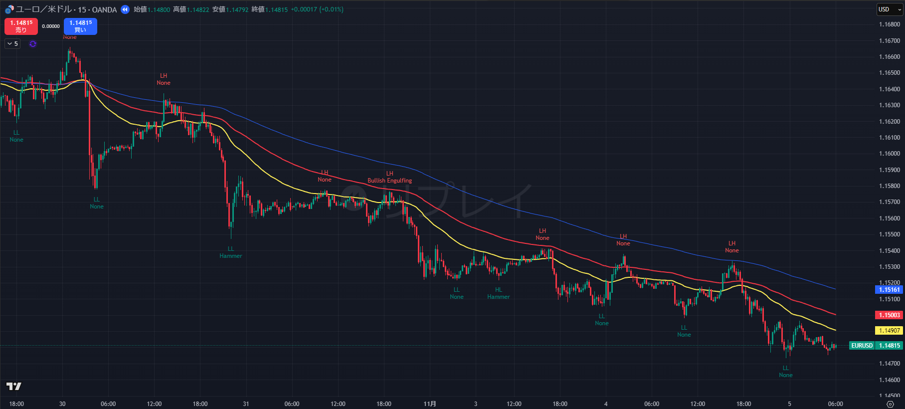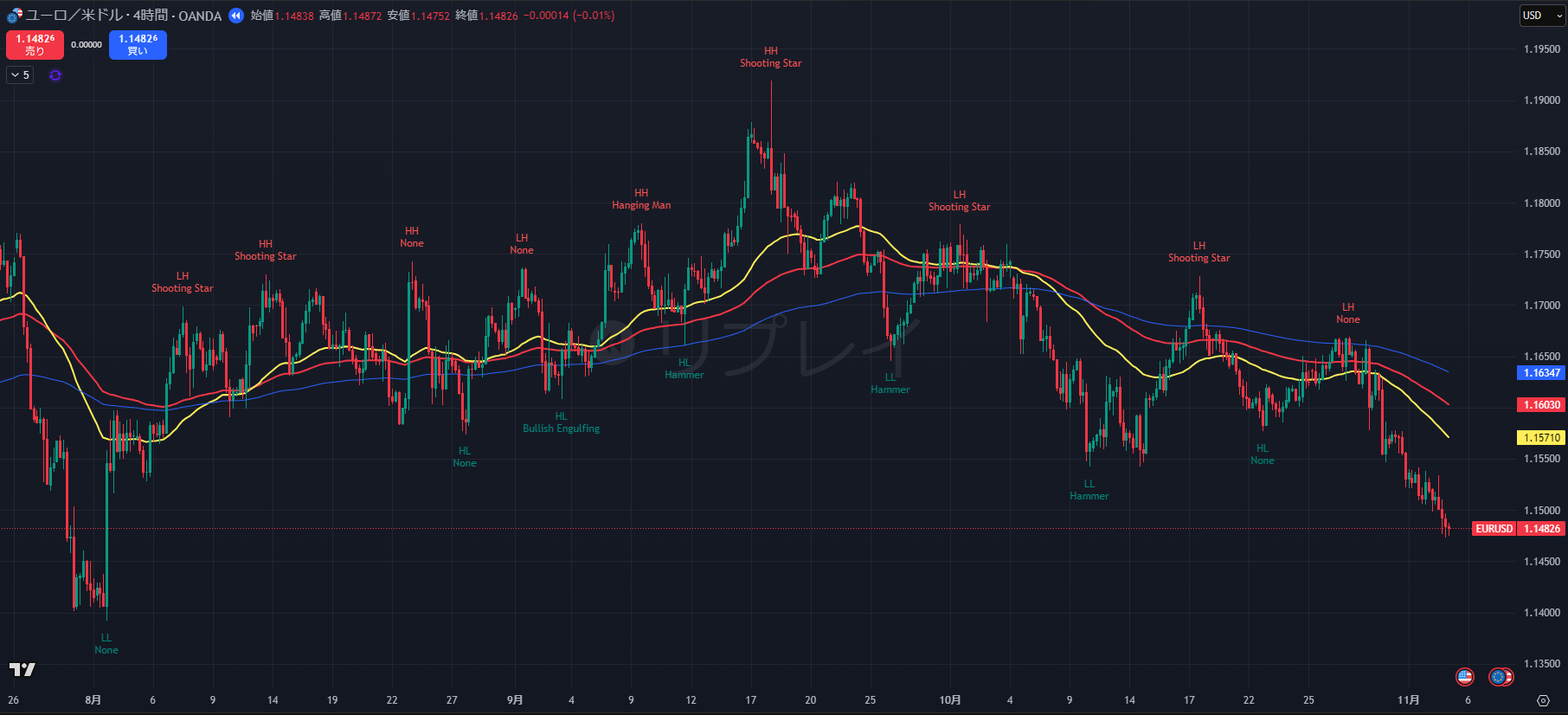 - 1.1480到達後、ヒゲを出して反発しています。これは利確による自律反発です。